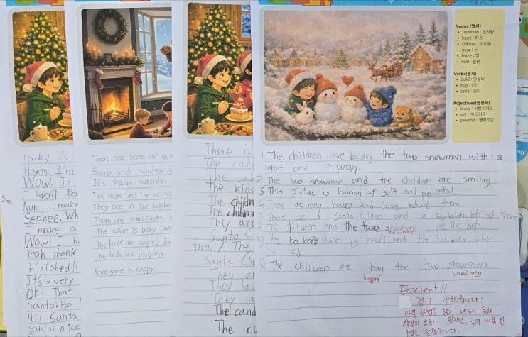 초등 4·5학년 아이들이 영어로 쓴 크리스마스 이야기 단어·문법을 넘어, 생각을 글로 표현하는 영어 수업 “이 글을 정말 초등학생이 쓴 거예요?” 이번 크리스마스, 마동 GnB 영어학원 초등 4·5학년 아이들이 영작 과제를 본 학부모님들이 가장 많이 하신 말입니다. ✔ 정답 문장 베끼기 ❌ ✔ 빈칸 채우기 ❌ 아이들이 보고, 느끼고, 생각한 것을 자기 힘으로 영어 문장으로 표현한 결과물입니다. ✏️ 초등 4·5학년, 이미 ‘영어로 생각하고 쓰고 있습니다’ 아이들의 영작을 보면 공통점이 있습니다. “It’s snowing outside.” “The kids are happy because today is Christmas.” "The children are building two snowmen with....... <img src="https://blogthumb.pstatic.net/MjAyNTEyMjRfNzAg/MDAxNzY2NTg0MTcxNDEz.J6LKRCnWxGK6mwPz3z0OJC2JZMzt4CUYUYihgMoCoxUg.bknG8DnLzrVip_NWCmkHVOR14J0AGU4OfCxpEwFSej4g.JPEG/KakaoTalk_20251224_224824979.jpg?type=s3" />