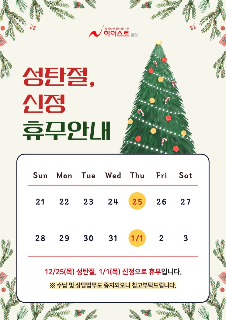 [하이스트 금천] 성탄절,신정 휴무 안내