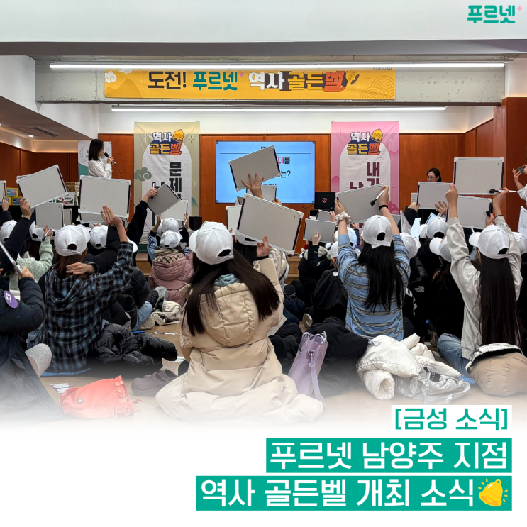 안녕하세요. 푸르넷입니다! 지난 2월 6일 금요일, 금성출판사 복합문화예술 플랫폼 KCS의 싹(ssak)동에서 푸르넷 남양주 지점의 역사 골든벨 대회가 개최되었습니다 푸르넷 공부방에서 한국사를 열심히 공부하며 갈고닦은 실력을 뽐내는 자리였는데요! 재미있고 유익했던 남양주 지점의 <도전! 푸르넷 역사 골든벨>, 열정 가득했던 그 현장을 소개합니다! 아침 일찍부터 용산에 있는 KCS로 달려온 남양주 지점 학생들! 골든벨 시작 전, 금성출판사 창립 60주년 기념 전시 <기록하는 사람들>을 먼저 관람했는데요. 60년 넘는 시간 동안의 교육·문화 출판물, 학교생활을 함께한 교과서, 금성출판사와 푸르넷의 역사 등을 책의 미로....... <img src="https://blogthumb.pstatic.net/MjAyNjAyMTFfNTgg/MDAxNzcwNzg2MTMyNzM5.xRfqfeZBUVFp8Sz7ctJ9ObtE2tiLXMB17Km2mgwRjesg.gPsuJpZ-whlMsCrxkLmtK112Kqi24CVAaPM0XrpKy8Eg.PNG/%BA%ED%B7%CE%B1%D7%BF%EB_%BD%E6%B3%D7%C0%CF.png?type=s3" />