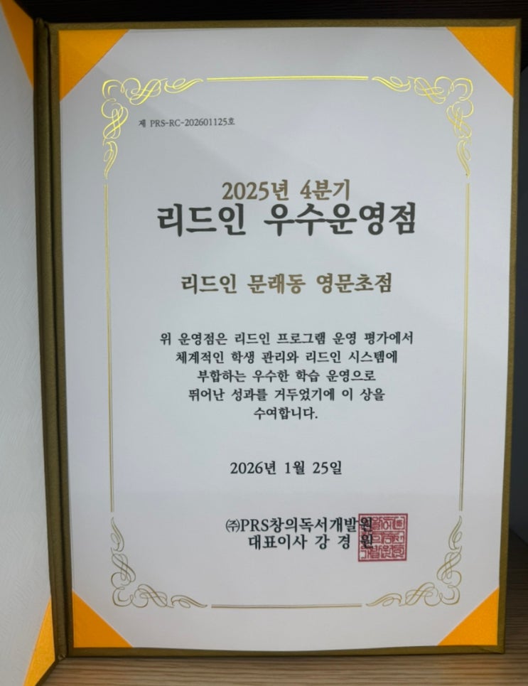 안녕하세요. 리드인 문래동 영문초점입니다 이번에 리드인 영문초점이 2025년 4분기 우수운영점으로 선정되었습니다. 프로그램 운영평가에서 체계적인 학생 관리와 리드인 시스템에 부합하는 우수한 학습 운영으로 좋은 성과를 거두었다고 평가해 주셨습니다. 이번 선정은 리드인 영문초점을 믿고 아이를 보내주신 학부모님들과 매일 성실하게 수업에 참여해 준 우리 아이들이 함께 만들어 준 결과라고 생각합니다. 리드인에서 말하는 ‘성과’는 점수나 결과만이 아니라, 아이들이 스스로 생각하고, 책을 통해 성장해 가는 과정입니다. 앞으로도 아이들 곁에서 꾸준히 고민하며, 책으로 성장할 수 있도록 돕겠습니다. 늘 믿고 맡겨주셔서 감....... <img src="https://blogthumb.pstatic.net/MjAyNjAyMTFfMzcg/MDAxNzcwNzkyMjEzMjE2.Dbv-RVCxiR9PPW4BJ6IbryPh6--rQVvuLJVC4vBp-acg.Th_xVDoExOVvACBsCQ-i7UGLzIu-3J6WwNO6olGMA3sg.JPEG/IMG%A3%DF7172.jpg?type=s3" />