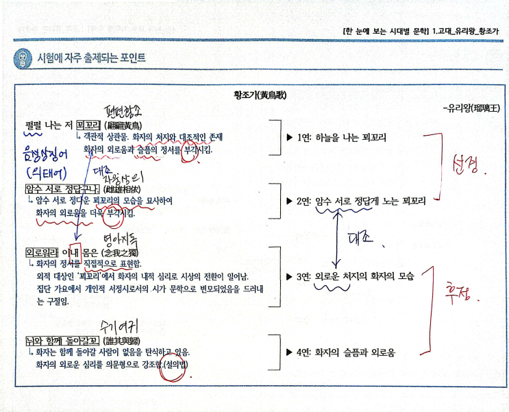 1. 유리왕의 '황조가' - 감정의 대비와 시상의 전환 황조가는 단순한 이별 노래가 아닙니다. 시험에 꼭 나오는 핵심 포인트를 완벽 정리합니다. 객관적 상관물: 펄펄 나는 '꾀꼬리'와 화자의 '외로움'이 어떻게 대비되는지 시각적으로 분석합니다. 선경후정의 구조: 1~2연의 외부 풍경(꾀꼬리)에서 3~4연의 화자의 내면(외로움)으로 이어지는 시상의 흐름을 완벽 이해시킵니다. 집단 가 요에서 개인 서정시로의 변모: 문학사적 가치까지 놓치지 않고 정리합니다. 2. 충담사의 '찬기파랑가' - 고도의 상징과 예찬 향가 중에서도 문학성이 가장 뛰어난 '찬기파랑가'는 상징하는 바를 정확히 매....... <img src="https://blogthumb.pstatic.net/MjAyNjAzMjZfNjEg/MDAxNzc0NDkwNTEyODA1._psfee_LAG97w-LQAYPSRj03sa7mMRL4sMFqgBAzK_4g.jgJVAgKY816-41yI5_gqu5He9m0_bBattC-9xxmkBRkg.PNG/%B1%B9%BE%EE1.png?type=s3" />