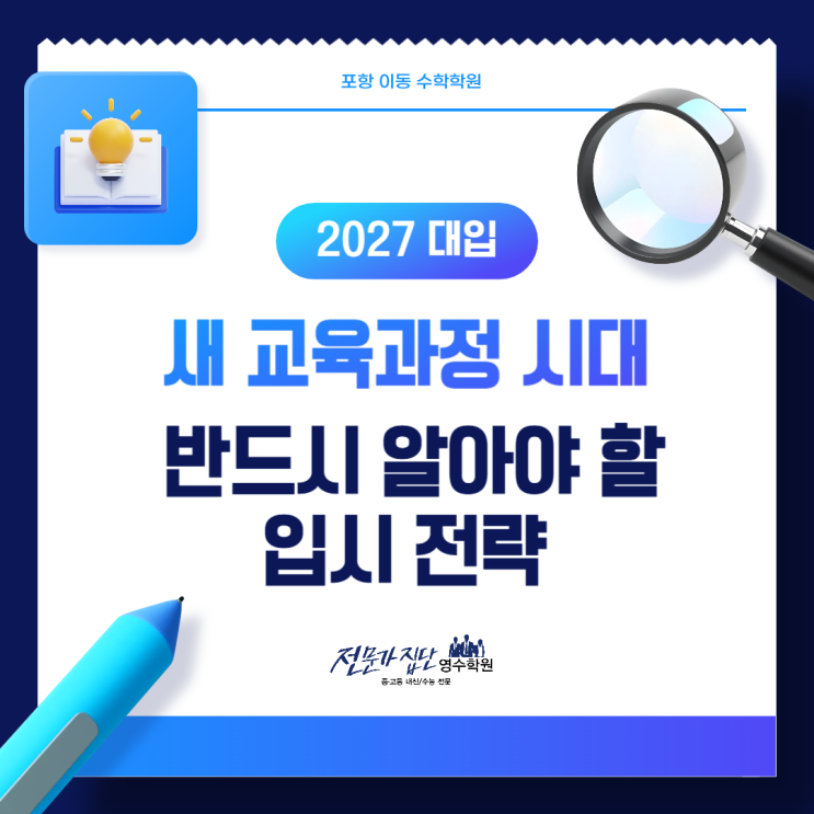 안녕하세요. 포항 이동에 위치한 초·중·고등 내신/수능 영어 수학 전문학원 전문가 집단 영수학원입니다. 새 학년을 앞두고 고입·대입 정보를 찾고 계신 분들이라면 요즘 가장 많이 듣는 말이 있을 겁니다. “2027 대입은 완전히 다르다.” 이 말은 결코 과장이 아닙니다. 학령인구 감소라는 구조적 변화 위에, 내신 5등급제 도입, 교과전형 서류평가 확대, 선택과목 이수에 대한 대학의 해석 변화가 동시에 겹치며 2027학년도 대입은 이전과 전혀 다른 궤도로 움직이고 있습니다. 특히 지금의 예비 고1 학생들은 9등급제와는 완전히 다른 평가 체계 속에서 고등학교 생활을 시작하게 됩니다. 이제는 단순히 “성적만 잘 받으면 된다”는 공식이....... <img src="https://blogthumb.pstatic.net/MjAyNjAyMDJfMjM4/MDAxNzY5OTk1OTA4MDY0.F5R6kWfj2IxvQ4t9yvWCml_FVeQwWTIuoMByt7ADV8og.QlM9GYrHyt8X5s6CFu3-9GVxO8HniNG_AVcezKGuoYAg.PNG/%C6%F7%C7%D7_%C0%CC%B5%BF_%BC%F6%C7%D0%C7%D0%BF%F8-001_%281%29.png?type=s3" />