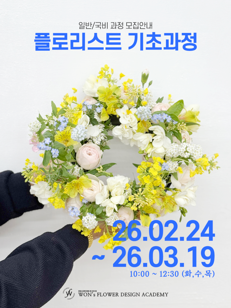 안녕하세요 ! 원스플라워디자인학원입니다 지친 일상 속에서 나만을 위한 힐링이 필요한 순간, 가장 먼저 떠오르는 게 무엇인가요? 많은 분이 '꽃' 을 배우고 싶어 하시지만, "손재주가 없는데 괜찮을까요?" "꽃을 하나도 모르는데 시작해도 되나요?" 하는 고민으로 망설이시곤 합니다. 그런 고민을 안고 계신 입문자 분들을 위해 준비했습니다. 꽃을 처음 접하는 사람도 누구나 가볍고 쉽게 시작할 수 있는 플로리스트 기초 과정을 모집합니다 ✨ 이런 분들께 추천드려요! - 꽃을 좋아하지만 다루는 법은 전혀 모르시는 분 - 취미로 꽃꽂이를 시작해보고 싶은 입문자 - 꽃의 기초 이론부터 차근차근 배우고 싶은....... <img src="https://blogthumb.pstatic.net/MjAyNjAxMjdfMTQz/MDAxNzY5NDk4MTYyOTU1.v-s63NSAB2hMVQfOknq6QGQGKbRAeX5IPkKz4KYtZwIg.3Q4IF-ngy5JNZw5jcEBvrXXwBreDShmNBvHubp6pBNQg.PNG/%C7%C3%B7%CE%B8%AE%BD%BA%C6%AE_%B1%E2%C3%CA%B0%FA%C1%A4.png?type=s3" />