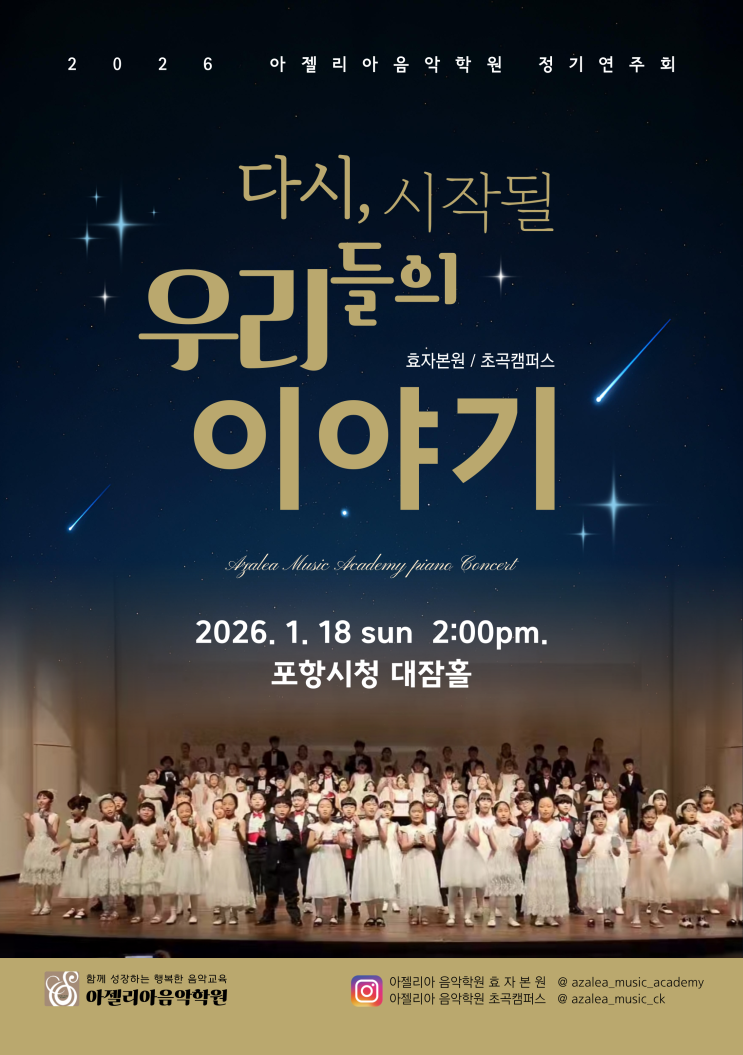 안녕하세요, 아젤리아 음악학원입니다. 오늘은 지난 1월 18일에 개최된 2026 아젤리아 정기연주회의 생생한 후기를 들려드리고자 합니다. 아젤리아는 매년 연주회를 진행해 왔었고, 매년 어떤 주제로 부모님과 소통할 것인지 많은 고민들을 해왔던 것 같습니다. 그런 우리들의 생각을 모아서, 이번 연주회의 주제는 "다시, 시작될 우리들의 이야기" 로 정해졌답니다. 특히 선생님들과 회의를 통해서, 이번 정기연주회에서는 우리가 아이들을 얼마나 사랑하는지, 또 얼마나 소중히 아끼고 있는지 그 진심을 전하자!! 라는 이야기로 마무리 되었답니다. 그 마음을 어떻게 전하면 좋을지 선생님들과의 거듭된 회의를 통해 생각을 나누고, ....... <img src="https://blogthumb.pstatic.net/MjAyNjAxMjZfMTI5/MDAxNzY5NDM5NTg1NjIx.qmUYF_9ey2og1bahxU6UCEwDG0rbdZXB_XcvZs_mKEkg.vzy2cKCz31Ez59rnZERN-8MgSp-LRw28ihP-z5P-Vkog.PNG/2026_%C1%A4%B1%E2%BF%AC%C1%D6%C8%B8_%C6%F7%BD%BA%C5%CD.png?type=s3" />