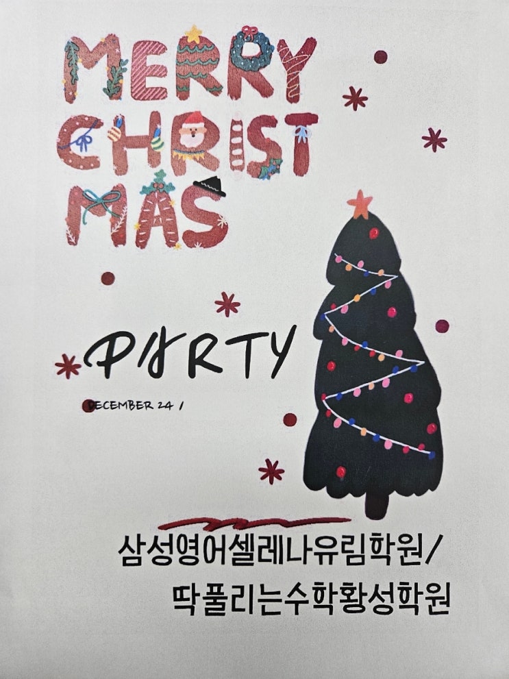 오늘은 크리스마스파티날이예요. 초등부는 2시~6시까지 마음껏 놀아요~ 떡볶이와 소떡소떡 간식 등 여러가지 음식과 놀이, 선물이 준비되어있어요. 오기만해도 15달러 증정, 선생님과 대결에서 이기면 달러 획득, 여러가지 게임을 하고 선물까지 받아가세요. <img src="https://blogthumb.pstatic.net/MjAyNTEyMjRfMjYg/MDAxNzY2NTQ2NDkwNDc5.976TOySr-Vac8TvgOgOeDQCR26Y152ZnjnCJdwdNEYYg.jeNWW9CIegHjIubnKidkcUk_5nJ9khiz8V_kEMW8mqcg.JPEG/900%A3%DF20251223%A3%DF213403.jpg?type=s3" />