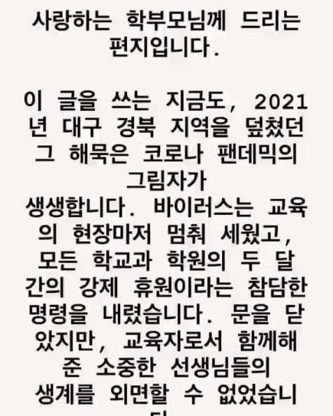사랑하는 학부모님께 드리는 편지입니다 이 글을 쓰는 지금도, 2021년 대구 경북 지역을 덮쳤던 그 해묵은 코로나 팬데믹의 그림자가 생생합니다. 바이러스는 교육의 현장마저 멈춰 세웠고, 모든 학교와 학원의 두 달간의 강제 휴원이라는 참담한 명령을 내렸습니다. 문을 닫았지만, 교육자로서 함께해 준 소중한 선생님들의 최소한의 월급이라도 챙겨주러 발을 동동 구르던, 말 그대로 벼랑 끝에 서 있던 나날들이었습니다. 그 때, 저의 무너져가던 마음을 붙잡아 준 두 가지 기적이 있었습니다. 첫 번째 기적은, 10년 전 우리 학원을 다녔던 제자에게서 왔습니다. 군 복무 중이던 그 아이가 대구 경북의 어려운 사정을 전해 듣고, 어머니를....... <img src="https://phinf.pstatic.net/image.nmv/blog_2026_04_03_2046/cjToGXdxS9_03.jpg?type=f480x480" />
