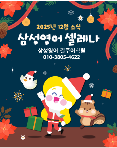 삼성영어길주어학원 2025년 12월 소식지 안녕하세요! 어느덧 2025년의 마지막 달입니다. 올 한 해 우리 아이들이 흘린 땀방울이 보석처럼 빛나는 12월, 길주어학원의 따뜻한 소식들을 전해드립니다. [12월의 주인공] 생일 축하합니다! 사랑 가득한 12월에 태어난 우리 친구들, 모두 진심으로 축하합니다! 학원에서 준비한 생일 선물 꼭 받아 가세요^^ ✨️12/13 김예찬 | 12/14 김지율, 이진원✨️ ✨️12/19 김영광 | 12/21 박시율 | 12/28 송정훈✨️ ⭐ 삼성영어 빛나는 Level Up!⭐ 성실하게 학습하여 단계별 레벨업에 성공한 친구들, 정말 대단해요! 축하 선물과 인증서를 전달합니다. ✨️Basic Level Up! 김다솜 학생✨️....... <img src="https://blogthumb.pstatic.net/MjAyNTEyMjRfMjMx/MDAxNzY2NTcyNjc3MzY1.AfmG4XOYpzlbb3392cK2uPWV4LNtZ0g_94iTb-Dr9OIg.bSAYabr29p_TKs7WclaglpoN8KcgZ8SDdxYZJOMkwvEg.PNG/1766570384600.png?type=s3" />