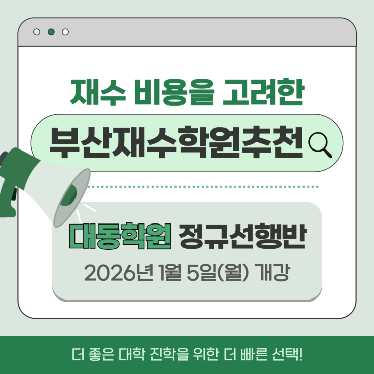 안녕하세요 대동학원입니다 2027학년도 대입성공을 위해 재수 비용을 고려하여 가성비 좋은 부산재수학원을 추천하려고 합니다! 먼저, 어떤 목표를 가지고 공부하는 학생들에게 추천할까요? 공부를 다시 시작해야 하는 시점, 학습 공백이 있었던 검정고시생, 유학생, 예비역, 직장인부터 처음 혹은 재도전을 준비하는 수험생까지 각자의 출발선에 맞춰 차근차근 준비할 수 있습니다. 아래는 재수학원 통학 및 기숙, 서울 및 지방의 비용을 비교한 도표입니다. 재수학원 비용(통학 및 기숙 / 서울 및 지방) 재수학원 비용은 지역과 운영 형태에 따라 차이가 있습니다. 본인이 원하는 학습 방식에 맞는 유형을 선택하는 것이 가장 중요합니다. 부산....... <img src="https://blogthumb.pstatic.net/MjAyNTEyMjRfMjUy/MDAxNzY2NTc2ODM5ODM0.hqQf12k71ReNe-AS3RW97dp9g8cWcBj2gXAVV8SnFpcg.X_zBvTng0gI_oh8kqVBf24uPmrygO5InLfWqcsukRRwg.PNG/%C1%A6%B8%F1%C0%BB-%C0%D4%B7%C2%C7%D8%C1%D6%BC%BC%BF%E4_-001_%287%29.png?type=s3" />