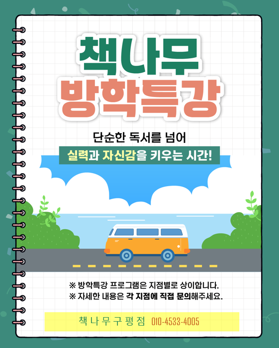 이번 방학, 공부의 방향을 바로 세우는 시간 몰입독서 · 한국사 · 한 번에 끝내는 중학 문법 방학 특강 안내 정규반 친구들은 할인 혜택 있습니다. (개별 문의 바랍니다) 방학은 아이의 학습 태도를 바꿀 수 있는 가장 중요한 시기입니다. 학기 중에는 따라가기 바빴다면, 방학은 기초를 다지고 다음 단계를 준비하는 시간이 됩니다. 이번 방학, 책나무 학원에서는 아이들의 연령과 학습 단계에 맞춰 ✔ 몰입독서 특강 ✔ 초등 고학년 대상 한국사 특강 ✔ 한 번에 끝내는 중학 문법 특강 을 준비하였습니다. 단순히 시간을 채우는 수업이 아니라, “왜 배우는지 알고, 스스로 공부할 수 있게 만드는 수업을 목표로 합니다." 몰입....... <img src="https://blogthumb.pstatic.net/MjAyNTEyMjZfMjA5/MDAxNzY2NzQzNjMxMDY0.xaIAEuKDeuqZYx5vQgLHksCaRdooxpwQkWUuhHIGK44g.hcDK149KF78AOdVhMluW_jBWXhSQ_tDTlRbf8Caeweog.PNG/%BD%BA%C5%A9%B8%B0%BC%A6_2025-12-26_190548.png?type=s3" />