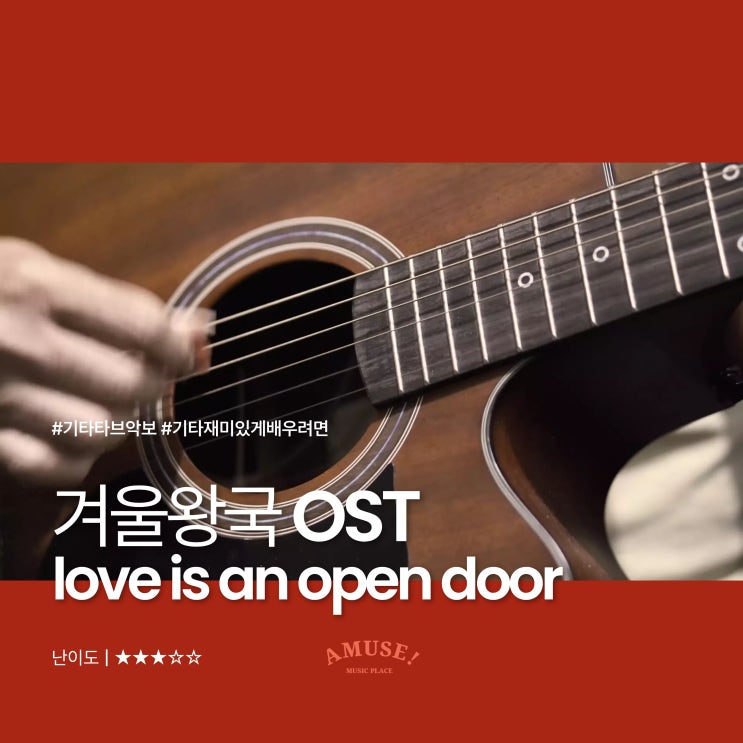 안녀하세요! 노원기타학원 어뮤즈뮤직플레이스입니다! 오늘은 전 세계를 사로잡은 디즈니 애니메이션 겨울왕국(Frozen)의 OST, 설렘 가득한 듀엣곡 ‘Love Is An Open Door’ 기타 타브 악보입니다! 이 곡은 2013년 개봉한 디즈니 애니메이션 겨울왕국에 수록된 곡으로, 안나와 한스가 처음 만나 서로에게 빠져드는 순간을 경쾌하고 사랑스럽게 표현한 듀엣 넘버예요! 사랑에 빠진 두 사람의 설렘과 들뜬 감정을 밝고 통통 튀는 멜로디와 리드미컬한 전개로 담아내어, 듣는 순간 기분까지 환해지는 곡이죠 특히 뮤지컬 넘버 특유의 대화하듯 이어지는 멜로디 라인과 서로 주고받는 하모니가 매력적이라 듀엣곡 연습용으로도 정말 좋은 곡입니다 기....... <img src="https://blogthumb.pstatic.net/MjAyNTEyMjZfMjQw/MDAxNzY2NzE5NDE0OTM0.xHA8CmSyj8hVOP4pNoAKhFhumlpFIe0HFjPpHhvMNowg.vTGuhLXrdjteq-yjL8eQMwqlnkU8ilderiS-KDoZlpYg.JPEG/%C1%A6%B8%F1%C0%BB_%C0%D4%B7%C2%C7%D8%C1%D6%BC%BC%BF%E4._%2819%29.jpg?type=s3" />