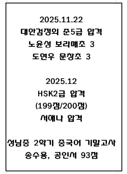 안녕하세요:) 여러분~~학원에 다시금 경사가 났습니다!! # 1 ★ 류*진 학생 (경문고2) · 25년도 1학기 중간고사 영어 전교 1등 (전교 유일 만점)!! · 25년도 2학기 전체 영어 전교 2등!! # 2 ★ 경문고2 2학기 (영어) · 1등급 9명 중 「5명」 · 1-2등급 합산 23명 중「12명」배출!! # 3 ★ 김*현 학생 (경문고2) · 25년도 2학기 2학년 전체 「전교 1등!!」 # 4 ★ 25년도 2학기 경문고 2학년 · 전교 1등, 2등, 3등 모두 배출!! # 5 ★ 성남고2 2학기 · 수강생 전원 (영어) 1-2등급 달성!! ☆스페셜 대견 학생☆ # 6 ★임*준 (성남고2) 중학교 꼬맹이 시절에 처음 만나 여러해에 걸쳐 선생님들의 복장(?)을 뒤집으며 애간장을 있는대로 녹이던 임.......