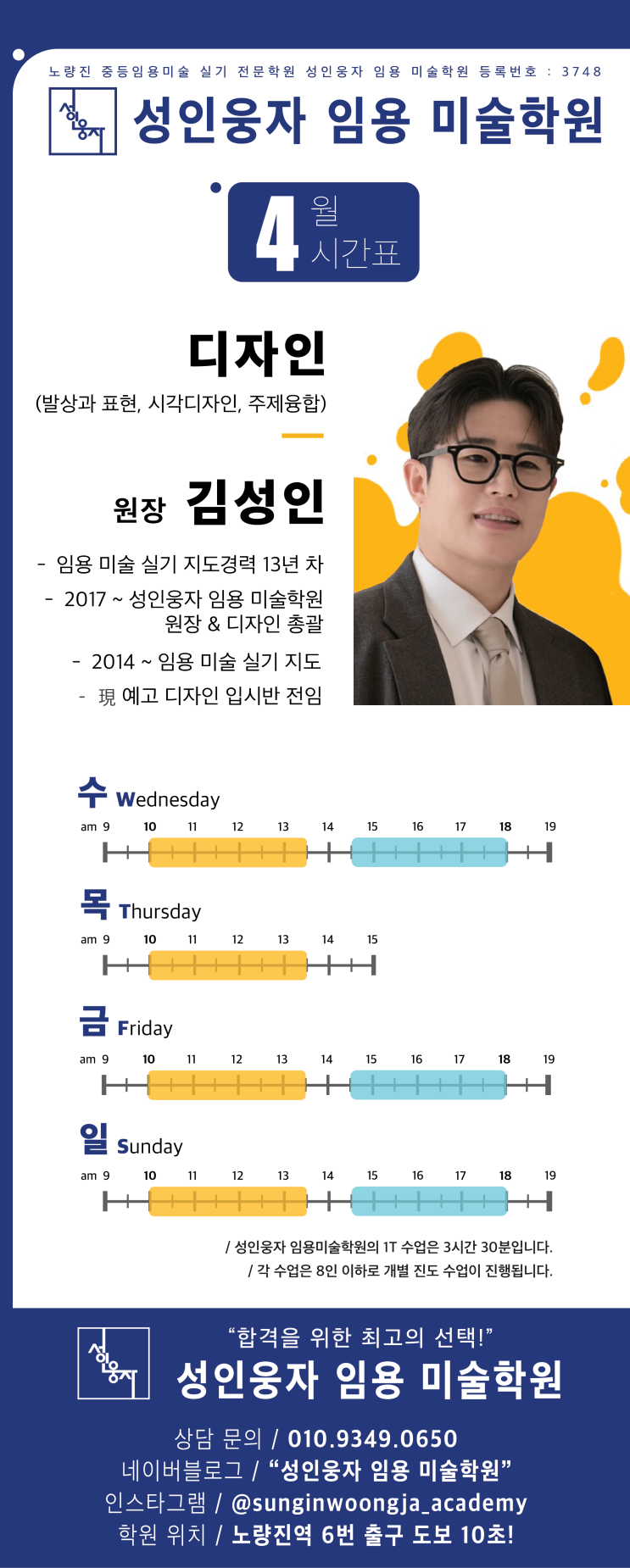 성인웅자 임용 미술학원 4월 수업 시간표 안내! 안녕하세요, 노량진 성인웅자 임용 미술입니다. 날씨가 풀리니 마음도 풀리기 딱 좋은 4월이 왔네! 이 시기엔 '열심히'보다 '제대로' 하는 게 중요하죠! 오늘은 성인웅자 임용 미술학원의 4월 수업 시간표를 소개합니다! 성인웅자 임용 미술학원 4월 <디자인> 수업 시간표 안내! 성인웅자의 미술 임용 디자인 수업은 1타임 3시간 30분으로 시범과 설명이 함께 진행되는 집중 모드로 진행됩니다! - 수 · 금 · 일: 10:00 ~ 13:30 (오전) / 14:30 ~ 18:00 (오후) - 목: 10:00 ~ 13:30 (오전 집중반) 2월~ 10월 예비반 수업은, 개인진도로 수업이 진행되기 때문에 개개인이....... <img src="https://blogthumb.pstatic.net/MjAyNjA0MDFfMjU4/MDAxNzc1MDA4NjI0MjQx.0wCmz3xOCaKixTVSj6Ic8azTmrIX8P2FDERKrQEIatYg.G-DWFGv6XkrJTWqSmSNACSUzvaUFu9w5UNwiTl2lnhYg.PNG/4%BF%F9_%BD%C3%B0%A3%C7%A5.png?type=s3" />