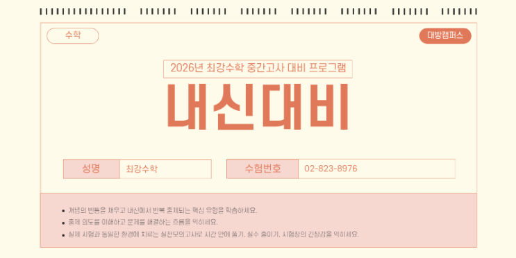 안녕하세요. 최강수학 대방캠퍼스 중등관입니다. 우리 최강수학 대방캠퍼스의 중간고사 대비 프로그램을 안내드립니다. 시험이 다가오면 많은 학생들이 문제를 더 많이 풀어야 한다고 생각합니다. 하지만 실제 시험 결과는 단순한 문제 풀이 양만이 아니라 어떻게 준비했는지에서 갈립니다. 최강수학 대방캠퍼스는 이 시기를 단순한 복습 기간이 아니라 점수를 만들어내는 전략 기간으로 운영합니다. 내신대비 기간동안 교과서 주요문제를 정리하며 +개념의 빈틈을 채우고 내신에서 반복 출제되는 핵심 유형을 중심으로 +자체 제작 교재를 활용하여 학습을 진행합니다. 이 과정에서 학생들은 단순히 문제를 푸는 것이 아니라 +출제 의도를 이해하....... <img src="https://blogthumb.pstatic.net/MjAyNjA0MDNfMTc1/MDAxNzc1MTk1MDgwMjcz.yyuGFZYJOL2wwYiuyQaIXAnCVAtK9G7el6tKJHfSasQg.OiPRzwaDzW3L4tQpXWXW6Et_yWDpinI8gu2cbuDdoqog.PNG/%C3%D6%B0%AD%BC%F6%C7%D0_%B3%BB%BD%C5%B4%EB%BA%F1.png?type=s3" />