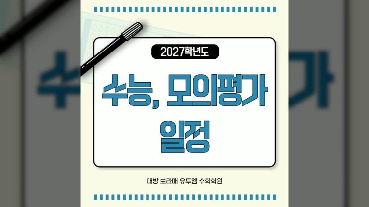 2027학년도 수능 및 6월, 9월 수능 모의평가 일정에 대해 대방 보라매 유투엠 수학학원에서 안내해 드리도록 할게요. 2027학년도 수능 일정 ▸ 응시원서 온라인 사전입력 2026년 8월 20일 (목) ~ 9월 3일 (목) ▸ 원서 교부, 접수 및 변경 2026년 8월 24일 (월) ~ 9월 4일 (금) ▸ 수능 시험일 2026년 11월 19일 (목) ▸ 수능 성적 통지일 2026년 12월 11일 (금) 2027학년도 수능 6월 모의평가 일정 ▸ 6월 모의평가 접수 일정 2026년 4월 6일 (월) ~ 4월 16일 (목) ▸ 6월 모의평가 시험일 2026년 6월 4일 (목) 2027학년도 수능 9월 모의평가 일정 ▸ 9월 모의평가 접수 일정 2026년 6월 19일 (금) ~ 7월 1일 (수) ▸ 9월 모의평가 시험일 2026년....... <img src="https://phinf.pstatic.net/image.nmv/blog_2026_04_02_2104/gzON1lpyay_01.jpg?type=f480x480" />