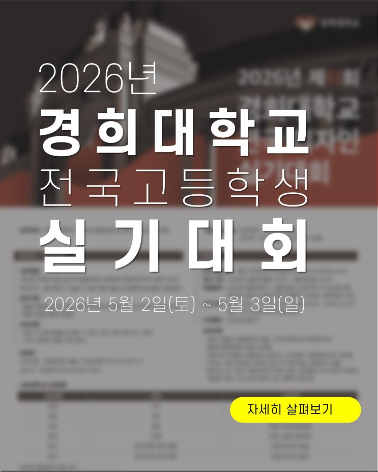 “이 대회, 생각보다 훨씬 중요한 시험입니다.” 많은 학생들이 ‘대회니까 경험이지’라고 생각하지만 실제로는 입시 실전과 가장 가까운 시험이기도 합니다. 2026 경희대학교 전국 고등학생 실기대회는 단순한 참가가 아니라 자신의 실력을 객관적으로 확인하는 자리입니다. 특히 디자인 입시를 준비하는 학생이라면 이 시험에서 어떤 결과를 내느냐에 따라 앞으로의 방향이 완전히 달라질 수 있습니다. ✔ 2026 경희대학교 실기대회 핵심 정리 이번 실기대회는 경희대학교 예술·디자인대학이 주최하는 전국 규모의 실기 시험입니다. 일정: 2026년 5월 2일 ~ 5월 3일 장소: 경희대학교 국제캠퍼스 전형: 기초디자인 참가 대상: 전국 고등학생 및....... <img src="https://blogthumb.pstatic.net/MjAyNjAzMjdfMjQ1/MDAxNzc0NjEwNTAyNzMw.pE0AixPUJ6-Spa4zLGpHaenqqMnbUJFEf47BHqQ4w3og.2NK_ISwkzA_2TomFklKrwtw8yXUEB0JfTTOjLjBSIw0g.JPEG/%BC%AD%BF%EF%B4%EB%C3%A2%C1%B6%C0%C7%BE%C6%C4%A7_2026_%B0%E6%C8%F1%B4%EB_%BD%C7%B1%E2%B4%EB%C8%B8_%BC%D2%BD%C4_%281%29.JPG?type=s3" />