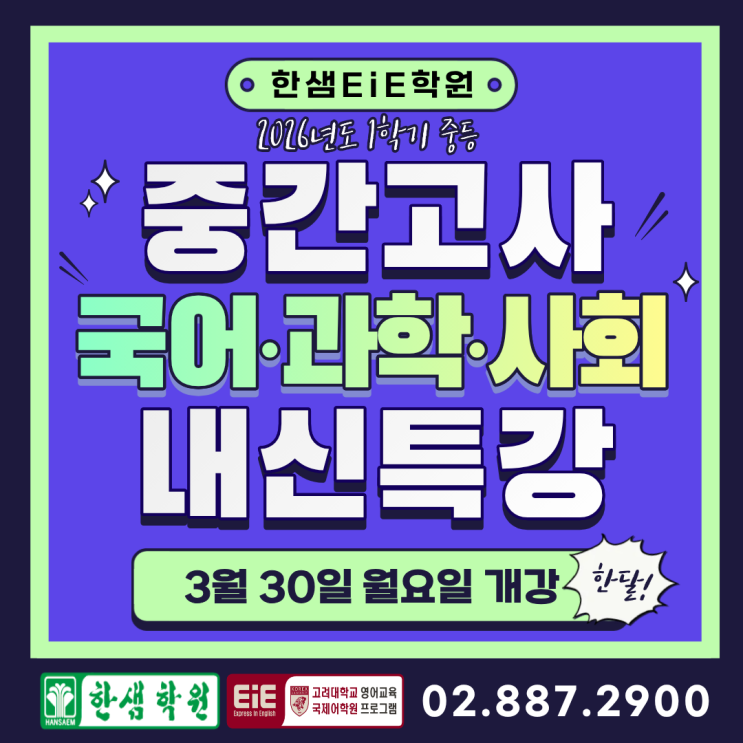 안녕하세요. 한샘 EiE 학원입니다. 2026년 1학기 중간고사 대비 국어/과학/역사·사회 내신 특강이 3월 30일(월) 시작됩니다. 영어와 수학 공부에 치중하여 그동안 준비하지 못한 과목을 집중하여 학습할 수 있는 한샘학원 특별강좌 입니다. 이준영 원장님과 내신에 최적화된 선생님들께서 열심히 최선을 다해 준비하였습니다. 과목별 수업 방법과 시간표를 아래에 공지하오니 많은 관심과 참여 바랍니다. 봉천한샘학원은 결과로 입증합니다. 감사합니다. ^^ #관악한샘EIE학원 #초중고_내신_입시전문 #중등_영수집중_연합반 #학교별_수행평가대비 #중등_영어#중등_수학#중등_국어#중등_과학#중등_사회 #중간고사#기말고사 #고등부_전과목_단과 #학....... <img src="https://blogthumb.pstatic.net/MjAyNjAzMjdfMjQg/MDAxNzc0NTkyMDUzODU4.ZGTi2ey9EB7rUrCQXgafYCzNKi2LjrlsB51mTgITeHMg.5MggAGBAja7XKPOH5PO2PrBrvSFl1_XFT485eEi7BBAg.PNG/1.png?type=s3" />