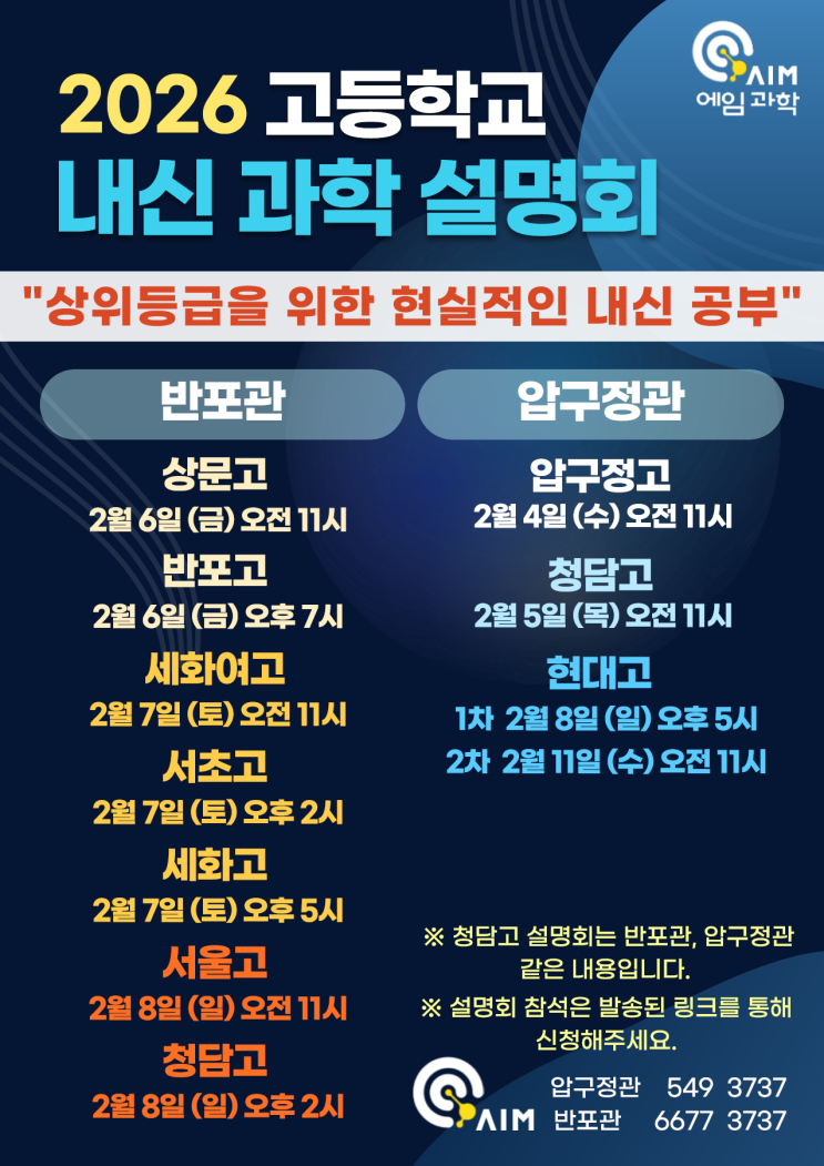■ 설명회 참석 신청 링크 및 전화문의 # 반포관 신청 https://naver.me/xquJIaGt 반포관 : 02-6677-3737 # 압구정관 신청 https://naver.me/xCtHIH3n 압구정관 : 02-549-3737 <img src="https://blogthumb.pstatic.net/MjAyNjAxMjhfNTMg/MDAxNzY5NjAwMDIyNjQy.vH1g_XrtL6ifO57HFnOoftF4ecmFuzSu7Rkd_J-ppNAg.agFkFPoCwfh_z36Bax0xe_lapiGDCUuV7UMd_YdnU1Eg.PNG/%BC%B3%B8%ED%C8%B8.png?type=s3" />
