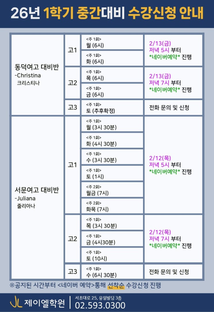 - 작성 및 수정 이력 - 2월 02일 : 수업 시간표 및 수강신청 일정 작성 안녕하세요 동덕여고영어전문학원 서문여고영어전문학원 제이엘학원입니다 날이 아직 추운 와중에 한줄기 따스함이 보이는 요즘입니다 새로운 학년을 떨리는 마음으로 준비할 학생들에게 지난 겨울이 성장을 이룬 연단의 과정이었길 바랍니다. 자녀분들이 목표한 성취 이룰 수 있도록 제이엘학원도 잘 준비하고 있겠습니다. 제이엘학원에서 2026년 1학기 중간대비 동덕여고 영어내신 서문여고 영어내신 과정을 다음과 같이 준비하였습니다 <<시간표(현황)>> 상단의 이미지와 현황은 차이가 있을 수 있으며, 정확한 현황은 학원으로 문의 주시기 바랍니다 <&l....... <img src="https://blogthumb.pstatic.net/MjAyNjAyMDJfMTk2/MDAxNzcwMDMwNTYyNjg5.EOuEMGKj7CofocHM-Mkq8WZDjEwhQZYDzgSeLhZUtIwg.ApqjNYwc9H3BvBeuhOSPyATJrVFfaUU0d4hQ3poWHxwg.JPEG/2026_3%BF%F9_%BD%C3%B0%A3%C7%A5_%B5%EE%B7%CF%BE%C8%B3%BB%BF%EB.jpg?type=s3" />