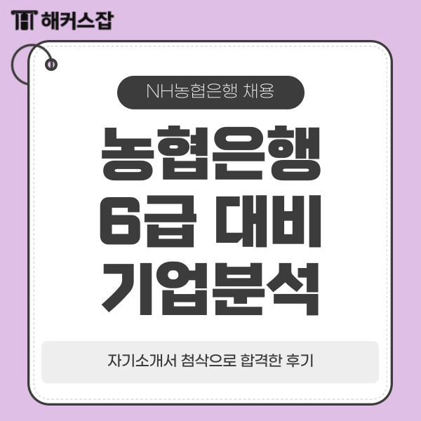 안녕하세요! 해커스잡입니다. 자기소개서를 작성할 때나 면접을 준비할 때 가장 먼저 해야 하는 부분은 기업분석이라고 할 수 있습니다. 그만큼 기업분석은 채용에 있어 중요한데요. 그래서 오늘은 NH농협은행 채용 대비 기업분석을 해드리겠습니다. 또한, 자기소개서 첨삭을 통해 농협은행 서류의 합격한 후기까지 소개해 드리겠습니다. 농협은행 서류를 준비하시는 분들은 오늘 포스팅 끝까지 확인해 보시기 바랍니다. NH농협은행 6급 합격 채용 대비 기업 분석 비전과 핵심가치 농협의 비전은 ‘변화와 혁신을 통한 새로운 농협’입니다. 기존 중앙회 중심의 경영 방식과 낮은 사업 경쟁력, 구조적 비효율에서 벗어나 근본적인 변화를 이루겠....... <img src="https://blogthumb.pstatic.net/MjAyNTEyMjRfMTIw/MDAxNzY2NTQ1MjkzNjE3.vbJ_Hvh001aISmrnEqIWQyRGpBRKIqRQKHA5VQTzg90g.rRLuUHURv-GsRrTKkYOT8yutPBMBn27LRr3Ct6C6QP0g.PNG/001.png?type=s3" />