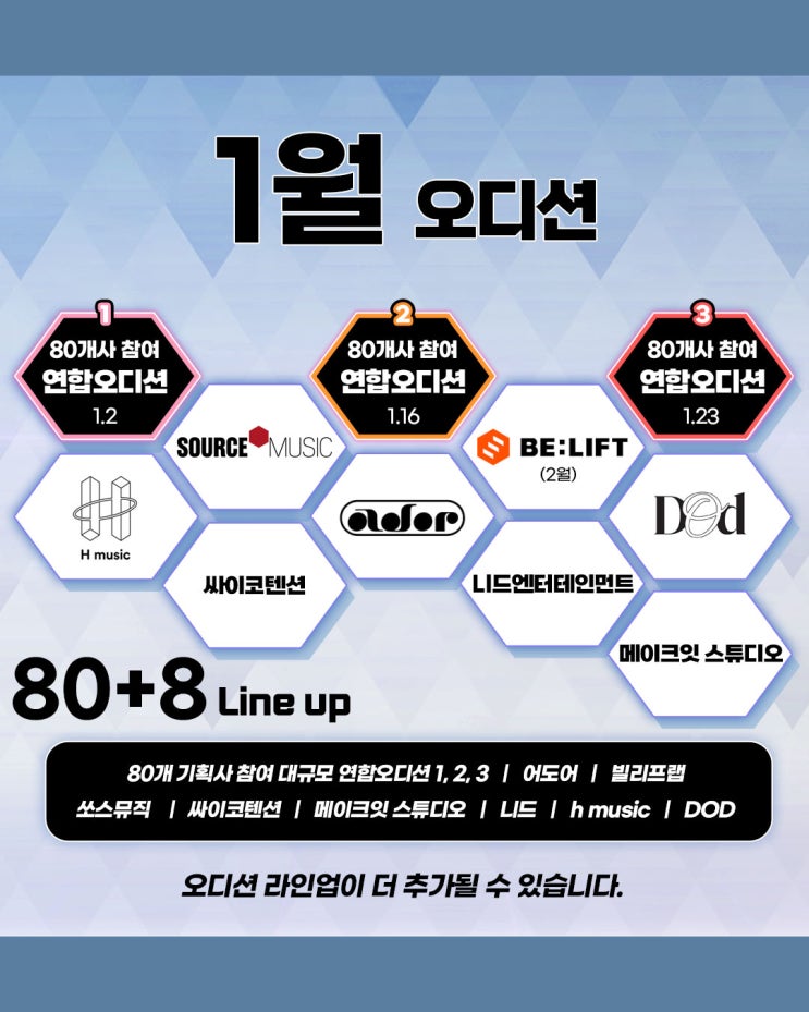 1월 내방오디션 | 80개 기획사 참여 대규모 연합오디션 1,2,3 ,어도어, 빌리프랩, 쏘스뮤직 등 80+8개 기획사 참여