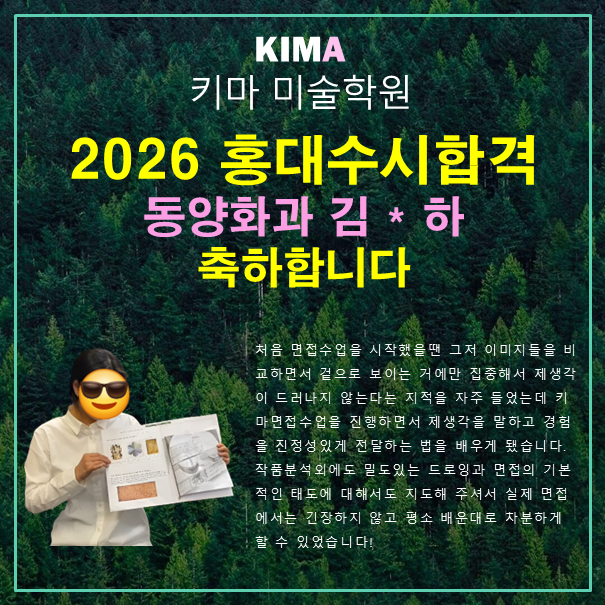 홍대 동양화과 합격! 김 * 하 합격후기 처음 면접수업을 시작했을땐 그저 이미지들을 비교하면서 겉으로 보이는거에만 집중해서 제생각이 드러나지않는다는 지적을 자주 들었는데 키마면접수업을 진행하면서 제생각을 말하고 경험을 진정성있게 전달하는 법을 배우게됐습니다. 작품분석외에도 밀도있는 드로잉과 면접의 기본적인 태도에 대해서도 지도해주셔서 실제 면접에서는 긴장하지않고 평소배운대로 차분하게 할 수 있었습니다! #홍대수시합격 #홍대수시면접준비 #홍대면접드로잉 #홍대면접작품분석 #홍대수시1차 #홍대수시2차 #키마미술학원 #홍대수시전원합격 #홍대미활보 #미술활동보고서 <img src="https://blogthumb.pstatic.net/MjAyNTEyMjdfMTEx/MDAxNzY2ODMyMDgyODI4.SL_7jfh1bMc9hkCWxFgLwcQt5SiZBn8yVBT3ueiox2og.o74xwUdcja2QgOh5Or1vKuIHnoNhov2rOlO8De8wze0g.PNG/%BD%BD%B6%F3%C0%CC%B5%E52.PNG?type=s3" />