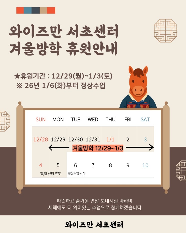 와이즈만 서초센터 2025년 연말 겨울방학 안녕하세요 와이즈만 서초센터입니다^^ 추위 속에 2025년이 거의 다 가고있고 2026년 붉은 말의 해가 오고 있습니다. 본격적인 새해로 들어가기 전, 약 1주간의 방학기간을 가지려고 합니다. 12월 30일 화요일 ~ 1월 3일 토요일 기간 동안은 방학으로 쉬어갑니다. 일주일간의 알찬 휴식을 가진 후 저희 와이즈만 서초센터는 다시 활기차게 수업을 진행할 수 있도록, 곧 다가올 겨울방학 특강들도 즐겁게 수업할 수 있도록 잘 준비하겠습니다. 감사합니다. < 와이즈만 서초센터 > 2025년 연말 겨울방학 안내 25년 12월 29일 월요일 ~ 26년 1월 3일 토요일 학원 방학으로 운영하지 않습니다. 상담 &a....... <img src="https://blogthumb.pstatic.net/MjAyNTEyMjdfMTQ2/MDAxNzY2ODA5MDc1MzYz.qGRYDWAb8n5VmzJrt2p-CGJ6ypF_If6n6v_B_IhzGkIg.xVXpK2JBvZRgokNO0HUSbYH44TLO012Jk4dD72HEgMog.JPEG/clipboardImage_25_1227_131627_863.jpeg?type=s3" />