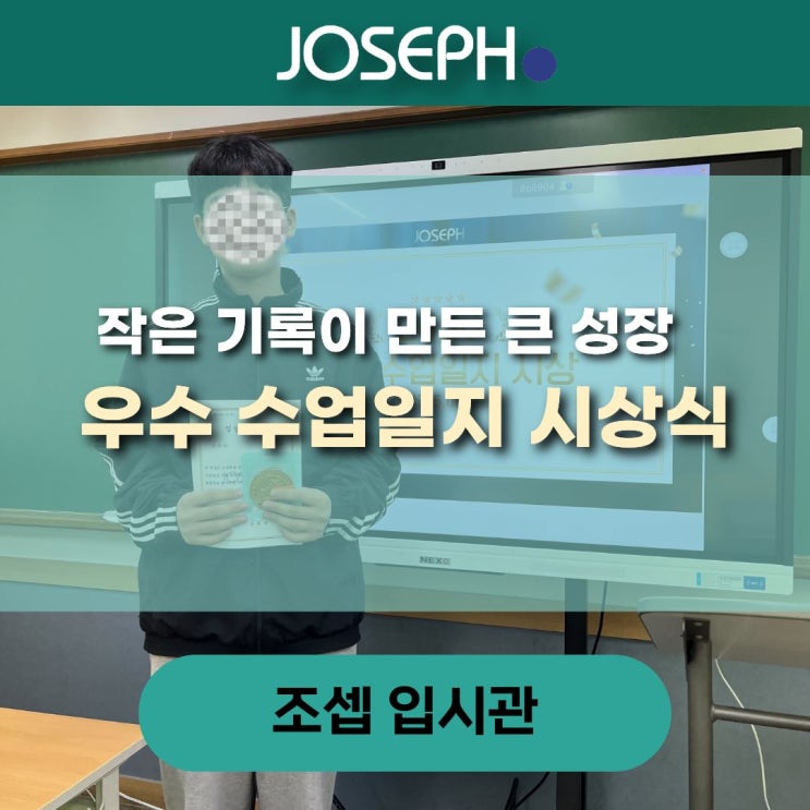 수업일지, 왜 써야 할까요? 조셉영어국어학원의 아이들은 수업이 끝날 때마다 펜을 듭니다. 바로 '수업일지'를 적기 위해서인데요. 이는 단순히 오늘 배운 내용을 복습하는 차원을 넘어섭니다. 메타인지의 시작: "내가 무엇을 알고 무엇을 모르는가?"를 스스로 질문하게 합니다. 어려움의 구체화: "그냥 어려워요"가 아니라 "수업 중 이 문법의 예외 조항이 이해가 안 갔어요"라고 구체적으로 적으며 자신의 약점을 직면하게 됩니다. 성장 앨범: 한 달 전 나의 고민과 오늘 나의 성취를 비교하며 '어제보다 나은 나'를 직접 목격하게 하는 장치입니다. 칭찬은 고래도, 중학생도 춤추게 한다! ....... <img src="https://blogthumb.pstatic.net/MjAyNjAzMDVfNTQg/MDAxNzcyNzE3MTIxNDMz.9E5VEfWXOz-AKCdsIH2xst6mdTXGN7IMxIXrdl8Mg-0g.SvLKa67KRqVbwXMs8_QLSLPTX0HC3zf68uFGUPX2_Twg.JPEG/7.jpg?type=s3" />