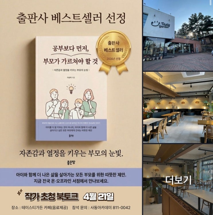 ★ 사동아카데미 학부모 클래스! ★ 작가 초청 북토크! “공부보다 중요한 것, 그 해답을 찾는 북토크! 베스트셀러 작가가 전하는 자녀교육의 기준과 명쾌한 해법” 자녀교육 분야 베스트셀러 작가, 한국미래인재연구소 이상덕 대표님을 초청하여 아이의 학습 방향과 교육에 대한 깊이 있는 인사이트를 나누는 시간을 마련했습니다. -일정 : 4월 21일(화), 오전 11시 30분 -장소 : 테이스티가든 카페(경산 사동) -음료 제공, 참석자 선물 증정 -대상 : 경산지역 학부모님 -지인 동반참석 가능 (사전 참석예약 필수) ※ 선착순 참여로 진행되오니, 희망하시는 학부모님께서는 학원으로 빠르게 신청 부탁드립니다. <img src="https://blogthumb.pstatic.net/MjAyNjA0MDNfMzUg/MDAxNzc1MjAyNDcxMTA1.g2u6_udX81lNbbKzpwBBUYqMJ4kRKROHBFPXF_MnmSYg.NoSCfWDlUc-qVzUPjahkkk3KYbbDXXmQe6CJA1jWSjIg.JPEG/IMG%A3%DF5026.jpg?type=s3" />
