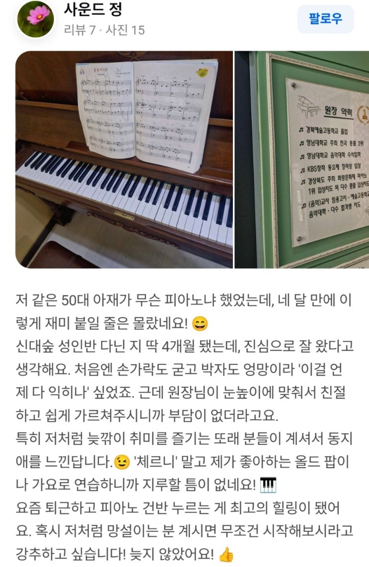 베토벤 곡만 벌써 여러 곡… 이번엔 ‘열정’ 1악장 오늘은 성인반 회원분의 연주 이야기를 소개해드려요 처음 오셨을 때만 해도 “제가 피아노를 할 수 있을까요?” 걱정이 많으셨던 분인데, 지금은 4년째 꾸준히 이어오시면서 무려 베토벤 소나타 23번 ‘열정’ 1악장에 도전하고 계십니다✨ 처음에는 빠른 패시지에서 많이 어려워하셨지만 꾸준히 반복 연습하시면서 조금씩 안정감 있게 만들어가고 계세요 이 곡은 베토벤 작품 중에서도 강한 에너지와 극적인 표현이 돋보이는 곡으로, 빠른 템포 속에서도 섬세한 터치와 강약 조절이 중요하고 왼손의 긴장감 있는 리듬 위에 오른손 멜로디를 잘 살려야 하는 난이도 높은 곡....... <img src="https://blogthumb.pstatic.net/MjAyNjA0MDRfMjUg/MDAxNzc1Mjk2NDQ3NDYw.h2XE4ISDbJEl3Mo700XBvz0uZmQmunT9QUu6w0Kx8g0g.UJct9lx50juTH5eH6wlZa_ppXD60xD2PtFJqsjQWlpwg.JPEG/900%A3%DF1775296444522.jpg?type=s3" />