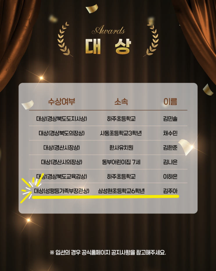 대상 금상 특선 행복한가족상 입선 순서입니다 입선제외 총 38명 수상자중에 대상 중에서 1등 장관상 1명 특선 1명 행복한가족상도 3명 그리고 전원 입선을 수상했습니다 축하해 주세요 #옥곡동미술학원 #공감아트 #패밀리페스타 #옥곡초등학교 #삼성현초등학교 #행복한가족 #저출산극복 # 미술대회 #경산어린이집 #중앙어린이집 #공모전대상 #옥곡동6살미술 #옥곡동7살미술 <img src="https://blogthumb.pstatic.net/MjAyNjAzMjhfMTUg/MDAxNzc0NjI2MDg5NDcx.S-lpKEgj4cGbwJwKfB8EkU8--gTnSFzEvFt3RvnrXncg.qBFox6tSkgkvvpCMWW4nvjlTNbVNhgSIa5VBOoE8g3Ug.PNG/900%A3%DF2.png?type=s3" />
