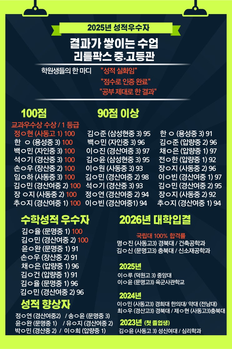 2025년 한 해 시험에서도 100점, 90점 이상 성적이 특정 몇 명이 아니라 여러 학교, 여러 학년에서 반복적으로 나왔습니다. ✔ 교과우수상 ✔ 1등급 ✔ 100점 다수 배출 ✔ 90점 이상 대거 분포 이 결과는 단기간 벼락치기가 아니라 수업–관리–복습 구조가 쌓여 나온 결과입니다. 우리 학원생들은 MZ 세대답게 이렇게 힙하게 말합니다.^^; “성적 실화임.” “점수로 인증완료.” “공부 제대로 한 결과.” 저희는 이 말을 가장 중요한 평가라고 생각합니다 아이들이 ‘열심히 했다’가 아니라 ‘점수가 나왔다’고 말할 수 있을 때 저희 수업은 제 역할을 했다고 봅니다. ▶100점 / 90점 이상이 계속 나오는 이유 리틀팍스 중·고등관은 문제를....... <img src="https://blogthumb.pstatic.net/MjAyNTEyMjNfMjA4/MDAxNzY2NDc2MzU5MDY5.NQXVqYTk4WklFhH4AwcrxdF07ZMrDitKR_aEbHeWN8Yg.PRsbNEzlDUTvQEPIyiaKIrsP_4sb7_pljejfToI5t_cg.JPEG/2025%B3%E2-%C1%DF%B0%ED%B5%EE%B0%E1%B0%FA%28%C3%D6%C1%BE1%29.jpg?type=s3" />
