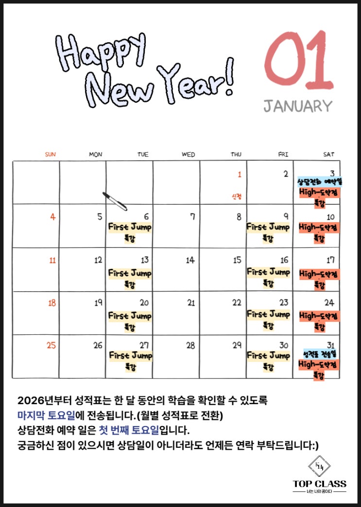 [탑클라쓰 영어학원] 2026년 1월 일정표
