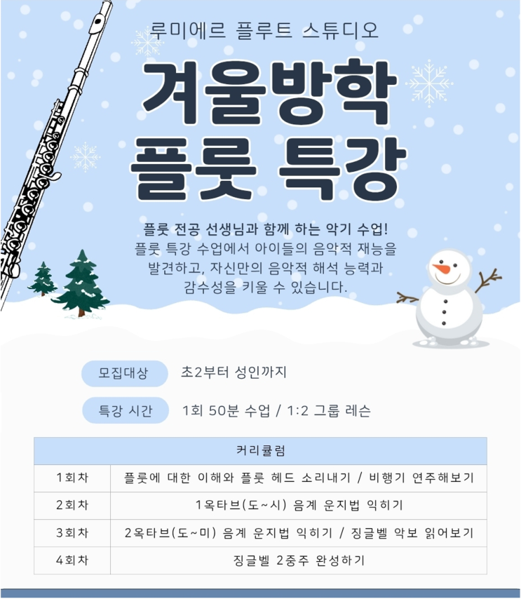 안녕하세요:) 이번 플룻 클래스에서 4주 단기 속성 수업이 가능한 플룻 4주 특강 클래스가 오픈되었습니다! 10년 이상 해외 유학 경험이 풍부하신 선생님과 함께라 더욱 가능한 플룻 4주 특강이랍니다! 4주만에 둘이서 연주가 가능한 2중주 연주라니!! 정말 엄청난 커리큘럼을 준비해주신 플룻 선생님>_< 모집대상은 초등2학년부터 성인까지 특강 수업시간은 1회에 50분 수업으로 혼자도 가능하고 친구와 같이 함께하는 수업도 가능하답니다! ( 3, 4회차에서 배우는 '징글벨' 말고도 다른 원하는 곡이 있다면 변경 가능합니다! ) + + + 추가적으로 플룻 악기가 없어도 플룻 악기 대여가 가능하니 문의 부탁드려요!ㅎㅎ 수업 문의....... <img src="https://blogthumb.pstatic.net/MjAyNjAxMDZfMTI2/MDAxNzY3NjkwMjg3MjU3.MGNzZXcAuUa1KJGP_N04-aIu0V8m0Z3Xj9leP5v-nn0g.wK_3bHzj5yvE0MzCjrOzrsiqOdhaAbDkolRsSbGr9k4g.PNG/%B1%D7%B8%B21.png?type=s3" />