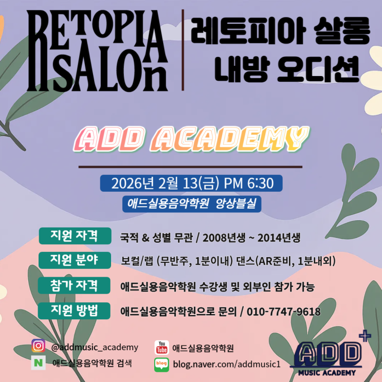 레토피아 살롱 내방 오디션 <레토피아 살롱>에서 애드실용음악학원을 방문해 함께하는 내방 오디션으로 2026년 2/13(금) 6:30 PM 애드실용음악학원 본원에서 오디션 실시합니다 본 오디션은 애드실용음악학원 수강생 및 외부 수강생도 모두 참가 가능합니다. <레토피아 살롱> 오디션을 희망하는 자는 010-7747-9618 문의 주세요. 일시 및 장소 2026년 2/13(금) 6:30 PM 애드실용음악학원 앙상블실 자격 국적 및 성별 제한 없음 / 2008 ~ 2014년생 까지 지원 분야 보컬 / 랩 / 댄스 댄스와 보컬(랩)은 중복 지원 가능 보컬 / 랩 : 무반주, 1분 이내 댄스 : 음악 준비, 1분 이내 오디션에....... <img src="https://blogthumb.pstatic.net/MjAyNjAxMDdfMjM2/MDAxNzY3Nzg0OTEyMjc4.VaCIJH-h7ZeVCLITXy082Oit5Lj5npcmfMdjVnI2_xQg.OQWUBQ3K2ti8sgDucWCrAN-AuN4mxfL2XMiYcbeqE-Ug.PNG/%BF%C0%B5%F0%BC%C7_%C0%CE%BD%BA%C5%B8_%B1%D7%B7%A5_%BB%E7%C0%CC%C1%EE-007.png?type=s3" />