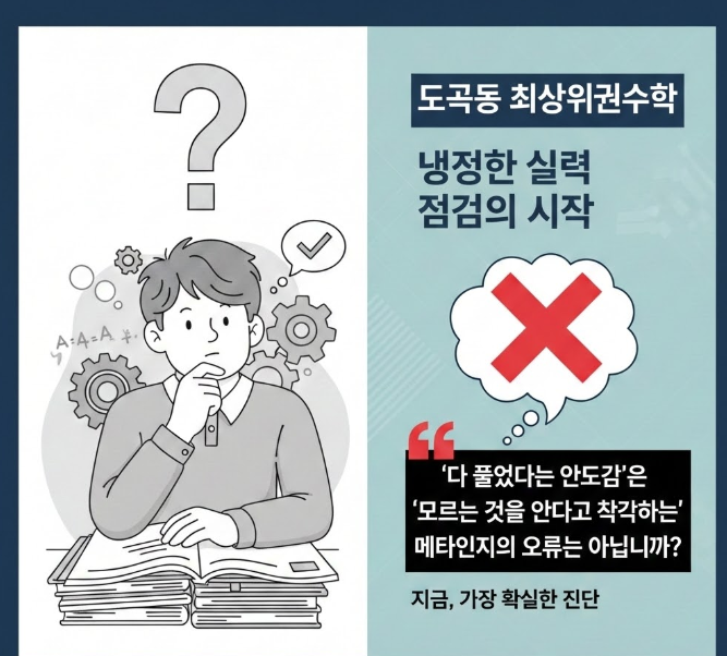 도곡동 수학학원 2월, 겨울방학 '진도'를 '성적'으로 바꾸는 최후의 전략 안녕하세요. 도곡동 수학학원 교육의 심장부, 아이들의 수학적 임계점을 돌파시키고 결과로 그 가치를 입증하는 최상위권수학입니다. 어느새 겨울방학의 절반이 지났습니다. 아마 대다수의 도곡동 학생이 1월 한 달간 숨 가쁘게 선행 진도를 나갔을 것입니다. 지역 내 명문고 진학을 앞두고 어떤 아이들은 공통수학1의 행렬부터 수능형 심화까지 문제집 몇 권을 끝냈다는 안도감에 젖어 있을지도 모릅니다. 하지만 도곡동 최상위권수학은 지금 이 시기에 가장 냉정하게 아이들의 실력을 점검해야 한다고 강조합니다. "다 풀었다는 안도감이 실은....... <img src="https://blogthumb.pstatic.net/MjAyNjAyMDFfODIg/MDAxNzY5OTA2OTc4Nzkz.hs07ApR8SDEo7ZuZlcVG2uzT7xt7ZZKyvWS270yDLYEg.cRrGTHHT2TK0RY7SboPO4UqxiSu0vccJREiSurYS2IAg.PNG/image.png?type=s3" />