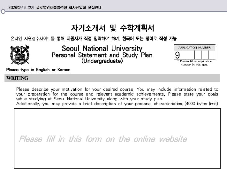 12년특례, 서울대학교 2026학년도 9월 가을학기 입학 자기소개서 서울대학교는 연세대학교와 함께 12년특례 전교육과정해외이수자전형에서 자기소개서를 도입하고 있습니다. 2026학년도 9월 가을학기 기준 서울대 12년특례전형에서 자기소개서 문항은 1개 문항으로 최대 4,000bytes 까지 작성할 수 있습니다. 서울대 12년특례 자기소개서는 한국어 혹은 영어 중 어느 언어로 작성해도 괜찮습니다. 하지만, 저희는 컨설팅을 진행하면서 학생들에게 가능하면 한국어로 작성할 것을 추천드립니다. 한국어와 영어 중 어느 언어로 작성하는 것이 더 유리하다고 이야기할수는 없지만, 가급적 대학 진학 후 학교생활과 학업을 이어가는데 충분한 언어능....... <img src="https://blogthumb.pstatic.net/MjAyNjAyMDNfMTE3/MDAxNzcwMTE1MjU3MTUw.jMKR52FtYtIdnI_ztjQOU_w94VGU1Aa6OEVI6hJaJpwg.Rhdzh8jbcpUgTuy3RYJzl5f5OTZ0POiRxd2ULcpESL0g.PNG/image.png?type=s3" />