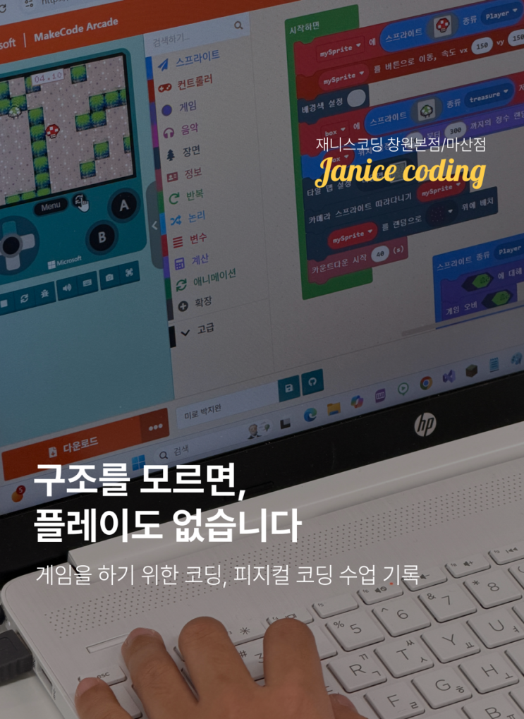 창원코딩 재니스코딩에서는 겨울방학동안 마이크로비트와 레트로 아케이드 실드를 활용한 피지컬 코딩 수업을 진행하고 있습니다. 처음 보시는 분들은 게임 만드는 수업인가요?라고 많이 물으시는데, 실제 수업 안에서는 게임은 결과일 뿐, 중심은 사고 과정에 있습니다. 결과보다 중요한 건 프로세스 아이들은 미로를 직접 설계하고, 보물상자를 찾는 게임을 만들었습니다. ✅ 타일맵으로 미로 구조를 직접 그리고 ✅ 벽을 설정해 갈 수 있는 길과 아닌 길을 구분하고 ✅ 스프라이트의 이동 속도와 방향을 조절하고 ✅ 랜덤 위치, 제한시간 같은 게임 조건을 하나씩 추가했습니다 겉으로 보면 블록 코딩이지만, 실제로 아이들이 하고 있는 일은....... <img src="https://blogthumb.pstatic.net/MjAyNjAyMDlfMzAg/MDAxNzcwNTY4MDk3MTU4.npRzy_dy53ui1mY0KvZ5rZnx_JgEEKskGkFpXXF4v4cg.DBp3muaKLs_tiED1o1DM6SjGaup2ld0miLYi19NrvY8g.PNG/%C1%A6%B8%F1%C0%BB%A3%AD%C0%D4%B7%C2%C7%D8%C1%D6%BC%BC%BF%E4%A3%DF%A3%AD003.png?type=s3" />