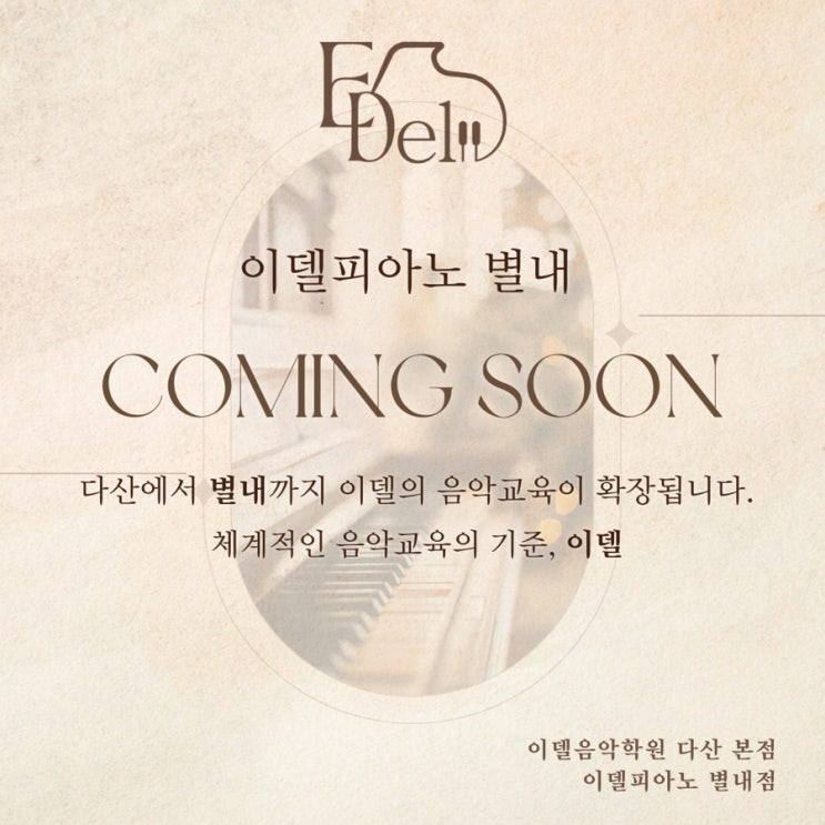 안녕하세요, 반가워피아노입니다. 그동안 저희 교습소를 믿고 소중한 아이들을 맡겨주신 학부모님들께 진심으로 감사의 인사를 드립니다. 아이들에게 더 나은 음악 교육 환경과 수준 높은 커리큘럼을 제공하기 위해 고심한 끝에, 2026년 새봄을 맞아 다산의 명문 음악 교육 브랜드인 '이델음악학원'과 손을 잡고 ‘이델피아노’로 새롭게 시작하게 되었습니다. 단순한 상호 변경이 아닌, 시스템의 전면적인 업그레이드를 약속드립니다 Q. 무엇이 달라지나요? 검증된 프리미엄 커리큘럼 도입 아이들의 연령별, 수준별 맞춤 교육이 더욱 세밀해지며, 체계적인 진도 관리 시스템을 통해 성취도를 높입니다. 수업 내용의 전문....... <img src="https://blogthumb.pstatic.net/MjAyNjAyMTRfMjcx/MDAxNzcwOTk1MjI5NjYz.qGdjyHcyNA3WNpTmX5GaHiOkgV6mhwQT_4L7S1ZkQEog.P2d8jH9NRXzXljiiYgmoR-09MDydgzEPVyAc1ucZb0Ig.JPEG/IMG%A3%DF0366.jpg?type=s3" />
