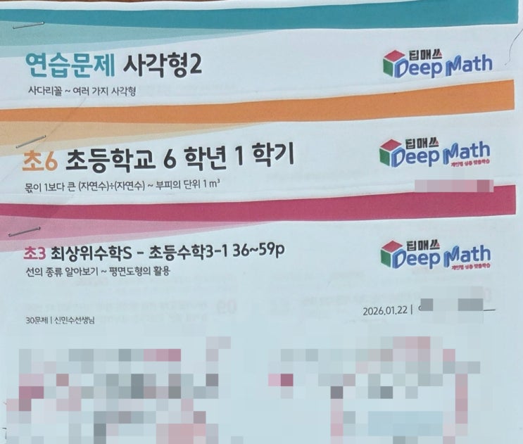 안녕하세요. 새해에도 열정 넘치는 목동딥매쓰 열정샘입니다. 오늘은 저희 목동딥매쓰의 시스템인 개인별 맞춤학습지와 일대일 밀착 첨삭 시스템에 관하여 이야기해 보겠습니다. "학원에서 주는 학습지를 푸는 것과 집에서 유명한 시중 문제집 한 권 사서 풀리는 거랑 큰 차이가 있나?" 하지만 저는 단호하게 말씀드립니다. "완전히 다릅니다." 똑같은 종이 한 장일지 모르지만, 그 안에는 시중 문제집 한 권에서 접할 수 없는 세밀한 난이도와 정밀한 데이터로 내 아이에게 맞는 목동딥매쓰만의 학습계획이 담겨 있기 때문입니다. 목동딥매쓰는 왜 시중교재가 아닌 아이의 수준에 맞는 데이터 기반으로 '나만의 학습지....... <img src="https://blogthumb.pstatic.net/MjAyNjAyMDRfMjI5/MDAxNzcwMTk0MzkyNTQ3.lEJUOpuKA6ZCl4PMZ8tCi9NSbrHV-OUB4y-uENlxsGog.5K1nwmpj7CGTdGAbfp5vHXEdoZflMctGG8O8t6YVCjUg.JPEG/KakaoTalk_20260204_172529686.jpg?type=s3" />