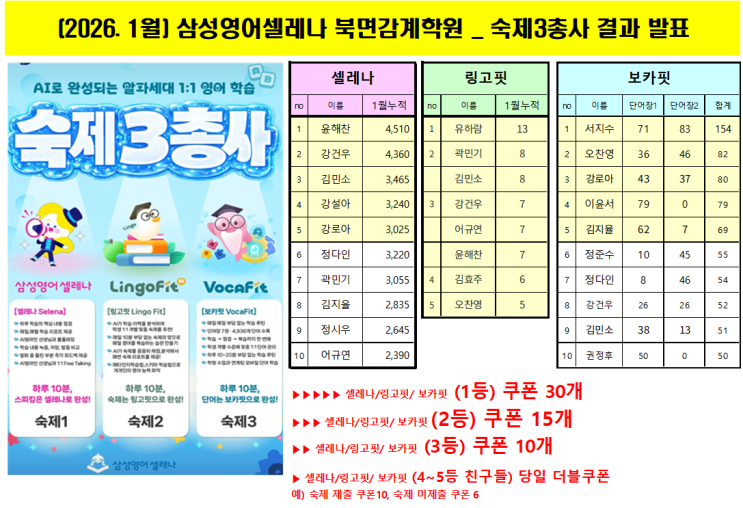 삼성영어셀레나 _ 2026년 1월 숙제 3총사 후기 [ 창원북면감계_삼성영어셀레나북면감계학원]