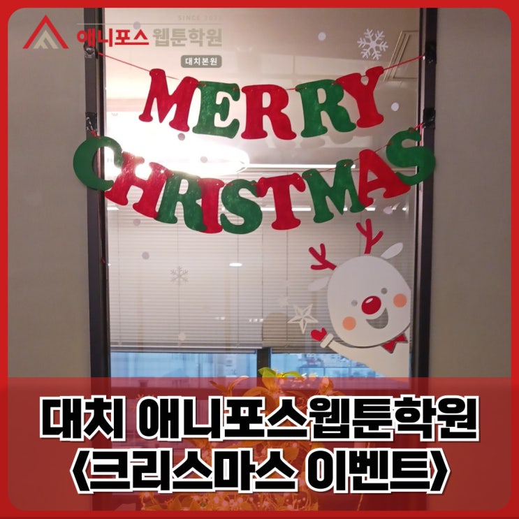 Merry Christmas & Happy New Year! 대치 애니포스 크리스마스 이벤트 안녕하세요~^^ 그리는 모든 순간이 특별해지는 곳! 초등·중등·고등(비입시) 전문 #디지털드로잉 #웹툰 #일러스트 #애니메이션 학원 대치 애니포스 웹툰학원입니다~! 강남웹툰학원, 대치 애니포스 웹툰학원은 겨울을 맞아 꽃단장을 했습니다^_^* 소소하게 꾸민 크리스마스 트리가 참 예쁘죠? ㅎㅎ 그리고 연말을 맞아 학생들과 함께 크리스마스 이벤트 수업도 진행했답니다♥ 함께 보실까요~? 겨울배경 일러스트 연출하기 중고등부 이벤트 수업에서는 동일한 겨울 일러스트 배경 위에 각자 창작한 캐릭터를 그려 넣어보는 작업을 진행했습니다~! 눈 내리는 겨울 풍경이라....... <img src="https://blogthumb.pstatic.net/MjAyNjAxMDhfMTAz/MDAxNzY3ODQ3MjM2Mjgz.iZeHZAYbk7EianDh8WQsXN0PjzvwwLDPTnSiqCnKRZEg.Hlvf80Q4BL0JjU4RSjZrLfWJ6eiWJ5tSDezQiuSkAf0g.JPEG/%B4%EB%C4%A1%C1%A1_%BA%ED%B7%CE%B1%D7-%BE%F7%B7%CE%B5%E5-%C5%B8%C0%CC%C6%B2-002.jpg?type=s3" />