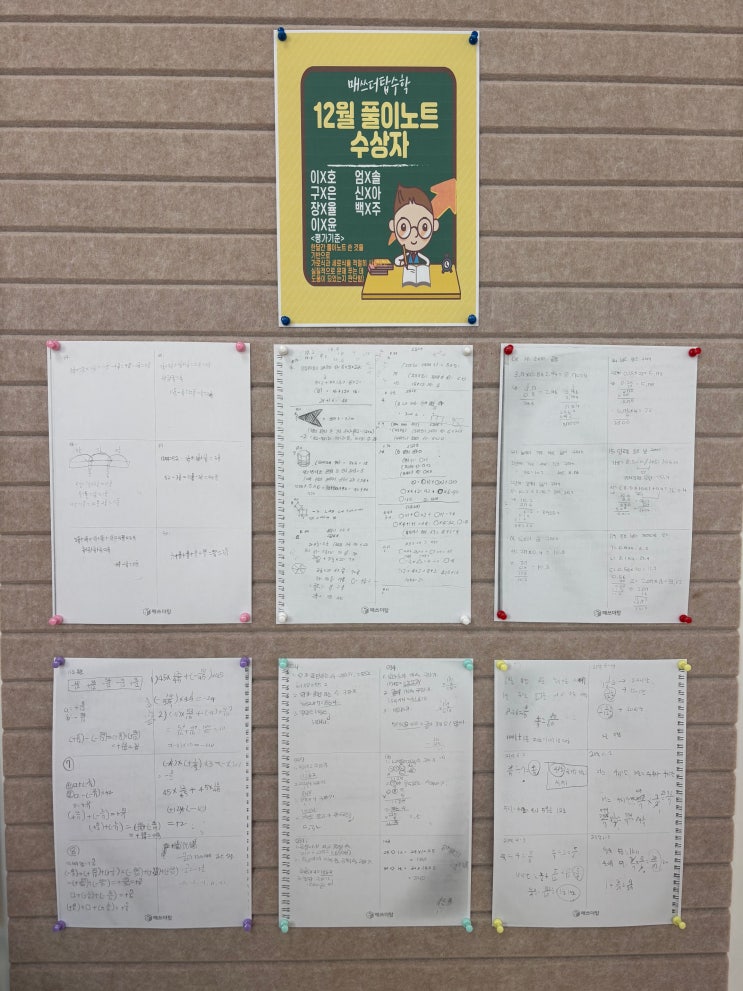 안녕하세요 매쓰더탑 수학입니다 매쓰더탑 수학학원에서는 문제를 얼마나 많이 푸는지보다 어떻게 풀었는지 어떤 과정으로 정리했는지를 더 중요하게 보고 있습니다. 그 기준을 가장 잘 보여주는 것이 바로 풀이노트입니다. 12월 한 달 동안 학생들의 풀이노트를 꼼꼼히 확인한 결과 총 7명의 학생이 12월 풀이노트상을 받게 되었습니다!! . . . 일단 영광의 주인공들부터 만나볼게요^^ . . . . . . . . . . . 이번 달 풀이노트를 평가하며 단순히 답이 맞았는지 여부만 본 것이 아니라 문제 상황에 맞게 가로식과 세로식을 올바르게 선택했는지 계산 과정이 흐트러지지 않고 잘 정리되어 있는지 풀이 순서가 한눈에 보이도록 정돈된 식 쓰기가 되....... <img src="https://blogthumb.pstatic.net/MjAyNjAxMDRfMjYz/MDAxNzY3NDk4NzQ3NzYz.R1W5V2jDSIWMmbMY6zHeagHSHrcQWqK4eETLlVGiE-Eg.qQu4cHKlZ7B-SHiW9MnFAbanXszyG9oGc1I1OTGNV7wg.JPEG/KakaoTalk_20260104_124532884.jpg?type=s3" />