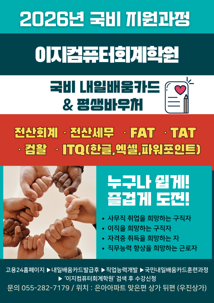 안녕하세요. 이지컴퓨터회계학원입니다. 2025년 새롭게 학원을 운영하면서 꾸준히 저희 학원을 찾아주시는 수강생분들 덕분에 감사한 한 해를 보내고 있는 것 같습니다. 수강생 한분 한분 모두가 소중한 인연으로 저희 학원을 방문해 주시고 있습니다. 대부분 처음 방문하시어 해 주시는 말씀이 '학원이 참 깔끔해요. ' '학원이 참 친절하네요.' '이곳에서 공부하면 잘 될 것 같아요' '강사 선생님께서 정말 열정적이세요.' 등 등.... 좋은 말씀을 많이 해 주시고 계시는 것 같습니다. 그런 수강생 분들의 마음을 새겨, 더 큰 학원으로 발전하기 위하여 2026년 이지컴퓨터회계학원이 국비지원....... <img src="https://blogthumb.pstatic.net/MjAyNTEyMDNfMTgx/MDAxNzY0NzMwMDAyMDk2.1sv6p1xnwP3CNESDKePdtmw-vaEzEKIBQUlIEoVH94Ig.aLzAdU2DoEN4skaMW8MrpwiD0m0uJlq2vypHFuDLjvsg.PNG/%C3%D6%C1%BE.png?type=s3" />