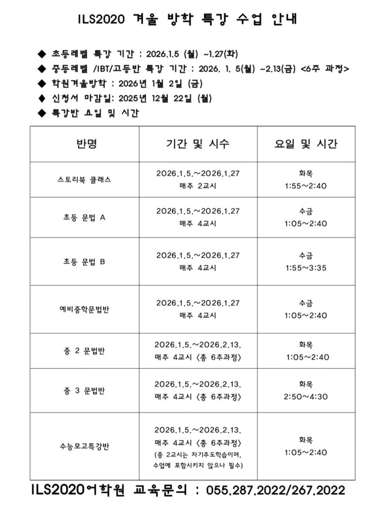 방학을 이용하여 그동안 부족했던 부분을 채울수 있는 특강 수업 안내입니다. 열공하고자 하는 학생들을 기다립니다~! #삼정자중#삼정자초#안남초#안남중#창원영어#성주동영어학원#수능#파닉스#스토리북#영어내신#1등급#초중고영어#성산구어학원#토플#특목고# <img src="https://blogthumb.pstatic.net/MjAyNTEyMThfMjc2/MDAxNzY2MDQ3MzY2OTA2.3L7LpeyzDAQVfg0VFZjqa52FTWOXhUB5OEpL5K2MKY0g.CpwMX5P6rEKw9dDm_v5cKnu45w6BDln-uDgXVIEOuvcg.JPEG/%B0%DC%BF%EF%C6%AF%B0%AD.jpg?type=s3" />
