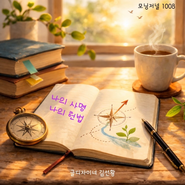 #나의헌법 #나의사명 #오늘의글감 #글디자이너_김선황 물론 작성부터~^^;; * 2026년 3월 9일 월요일 모닝저널 1008 내 삶의 헌법 어제 읽은 《성공하는 사람들의 7가지 습관》에 ‘자기사명서’라는 말이 나옵니다. 저자 스티븐 코비는 자기사명서를 “개인의 헌법”이라고 말합니다. 나라에는 헌법이 있고 회사에는 사훈이 있습니다. 그렇다면 한 사람의 삶에도 방향을 정해 주는 기준이 있어야 한다고 말합니다. 헌법이 국가의 방향을 정하듯 자기사명서는 삶의 방향을 정해 줍니다. 무엇을 선택할지 망설일 때, 어떤 길이 나다운 길인지 고민될 때 돌아볼 수 있는 기준이 되기 때문입니다. 하루하루 바쁘게 살아가지만 정작 왜 그 길을 걷....... <img src="https://blogthumb.pstatic.net/MjAyNjAzMDlfMzUg/MDAxNzczMDIxOTc2MjY3.7WeKzPd6qDweFxhGQPsgNrw8YhDnIQXata8NjzbWR1wg.9xrd2vCF16yglL1hhNf11XbReguKv8rsQGlndNIWNbEg.JPEG/900%A3%DF20260309105837.jpg?type=s3" />