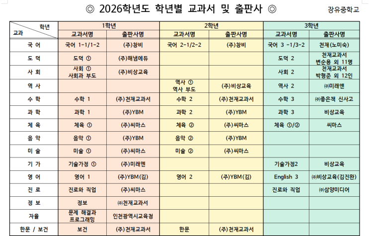 [장유중 교과서] 장유중학교 학년별 교과서 목록
