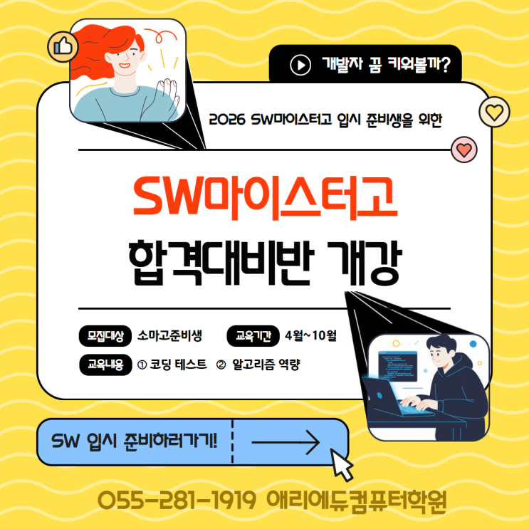 안녕하세요. 창원코딩맛집 애리에듀컴퓨터학원입니다. 부산소프트웨어마이스터고등학교와 대구소프트웨어마이스터고등학교를 준비하고 있는 학생들을 대상으로 소프트웨어마이스터고등학교 (이하 소마고) 대비 특강을 개설해요. 대상: 현재 중학교 3학년 학생대상 (7개월과정) 난이도: 프로그래밍 기초부터 시작해 특별전형 난이도까지 단기 집중 교육합니다. 늦었을땐 늦었다고 이야기 해드리는 애리에듀입니다. 하나도 준비가 안되어 있다? 늦은거 맞아요. 살짝 늦긴 하지만 저희는 매번 그 어려운걸 해냅니다. 상위권 성적으로 티나는 아이들은 선생님들께 강한 인상으로 자리잡게 하기도 하죠. 학교 선생님들께서 너도 OO다니냐? 하실 정도니....... <img src="https://blogthumb.pstatic.net/MjAyNjAzMzBfMTYx/MDAxNzc0ODcyMTExOTY5.TkHisfs3LvCyXosJIaf4Jbd0d6fwa43L2FxEeMpv5H0g.824dek8ihEN9oRXuBR1D98HFmlhDba5Kc6EN1WmwfAsg.PNG/SW%B8%B6%C0%CC%BD%BA%C5%CD%B0%ED_%B4%EB%BA%F1%B9%DD_%B0%B3%B0%AD_-_4%BF%F910%BF%F9_%287%B0%B3%BF%F9_%B4%DC%B1%E2_%B0%FA%C1%A4%29_055-281-1919_%C0%CC_%B3%BB%BF%EB%C0%CC_%B4%E3%B1%E2%B5%B5%B7%CF_SNS%BD%E6%B3%D7%C0%CF%BF%EB_%C6%F7%BD%BA%C5%CD_%B8%B8%B5%E9%BE%EE%C1%E0.png?type=s3" />