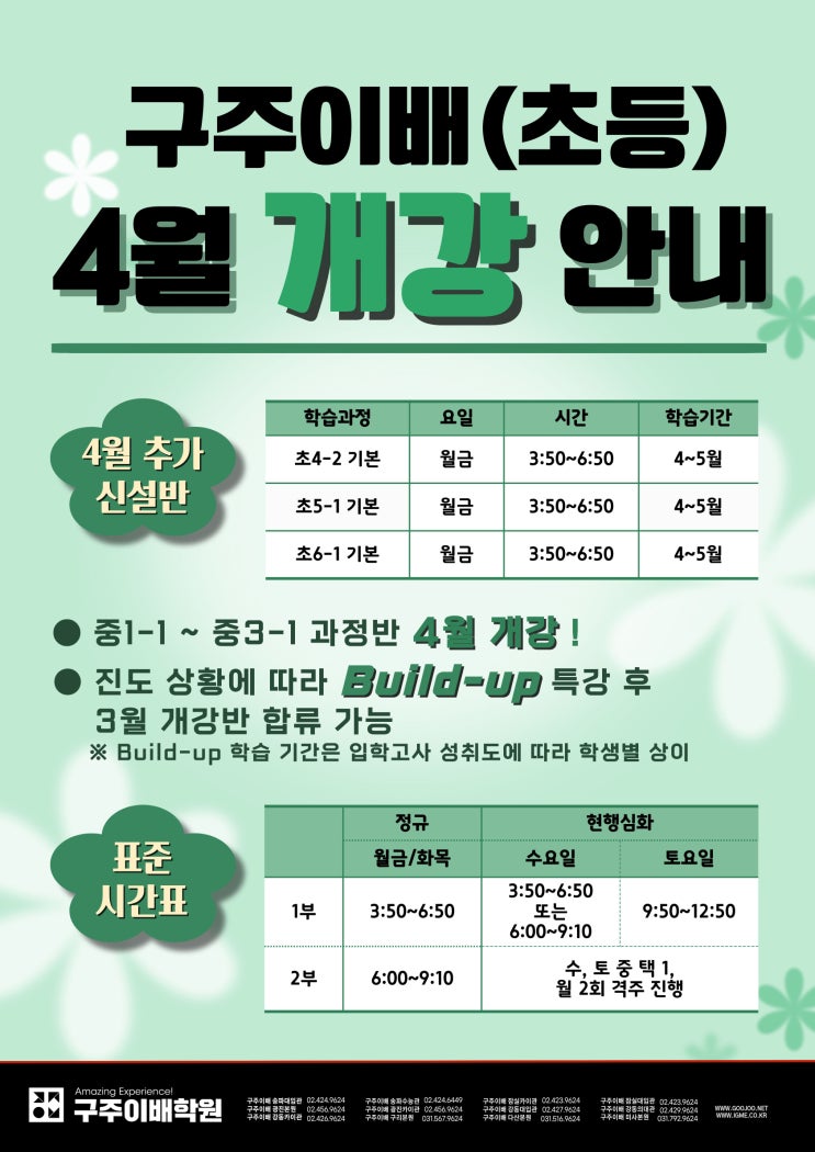 안녕하세요 구주이배 잠실본원입니다. ✨4월 추가 신설반✨ ✨4월 중1-1~중3-1 중등과정반 개강 ✨진도 상황에 따라 Build-up 특강 후 3월 개강반 합류 가능 ※ Build-up 학습 기간은 입학고사 성취도에 따라 학생별 상이 ✏️구주이배 입학고사 안내✏️ 시험 일정 평일(월-금): 5시, 7시 토요일: 11시, 1시, 3시 시험 범위 현행 + 최대이수 2과목 (한 과목당 15문항, 30분 소요) ※학생 학습 과정에 따라 응시 과목수 상이 응시료 : 10000원 신청 방법 온라인 예약 전화 예약 : 02)423-9624 성적결과 : 2일 이내 순차적으로 유선상담 진행 궁금하신 사항은 학원으로 문의하여 주시기 바랍니다. 고맙습....... <img src="https://blogthumb.pstatic.net/MjAyNjAzMTNfMTc2/MDAxNzczMzg1MjEwMDI2.LlRnGjUG5jHxnAwZWItDEAwUH3EOydIzakGpyZ3HbHsg.kOtm0KajJcne_16dcMQAjpKyW6ObGS_H6p1ucudNfoQg.JPEG/2026_4%BF%F9_%C3%CA%B5%EE%BA%CE_%B0%B3%B0%AD_%C6%F7%BD%BA%C5%CD..jpg?type=s3" />