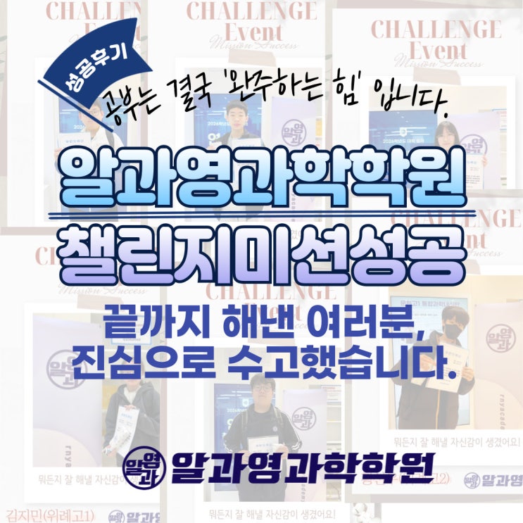♥축하합니다! 알과영 챌린지 미션 완료♥ 안녕하세요. 과학을 잘 아는 과학을 잘 하는 알과영과학학원 위례관입니다. 이번 겨울방학 동안 진행된 ‘알과영 챌린지 미션’이 성공적으로 마무리되었습니다. 20% 이상의 학생, 완벽 수행 달성 ■ 20% 이상의 학생, 완벽 수행 달성 이번 챌린지는 단순한 이벤트가 아닌 ‘꾸준함’과 ‘자기관리’라는 가장 중요한 학습 습관을 만드는 프로젝트였습니다. 그리고 놀.랍.게.도. 전체 참여 학생 중 20%가 넘는 학생들이 ✔ 단 한 번의 결석 없이 ALL 출석 ✔ 단 한 번의 미루기 없이 ALL 과제 수행 이라는 쉽지 않은 목표를 끝까지 완주했습니다. 이는 단순한 참여가 아닌, ‘끝까지 해내는 힘’을....... <img src="https://blogthumb.pstatic.net/MjAyNjAzMjlfMTQz/MDAxNzc0NzY4NTkwNzM1.spexkHSx9GQvPRqR9AbL6ZMZWG1GY-idw5DgngbI20wg.7o7-RzJkiv3RmfW-xOpzKToeiUpFLNgKGkwaEoruTkUg.JPEG/%C3%A7%B8%B0%C1%F6%BC%BA%B0%F8%C8%C4%B1%E2%B1%DB.jpg?type=s3" />