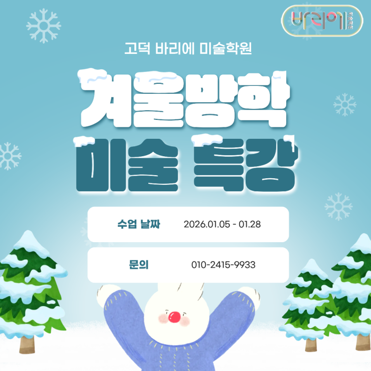 안녕하세요! 강덕초 고덕초 근처에서 미술지도를 잘 하고 있는 고덕 바리에 미술학원 입니다! 이번 겨울방학 특강으로는 누구나 쉽게 배울 수 있는 기초부터 작품 완성까지 심도있게 수채화를 배워볼 수 있는 수채화특강을 준비했습니다. 고덕 바리에 미술학원에서는 그림 그리는 것을 사랑하는 아이들의 실력과 표현력을 극대화 시키며 그림에 대한 감각과 자신감을 자연스럽게 키워갈 수 있도록 세밀하게 지도하고 있습니다~ 이번 수채화 특강은 두 반으로 개설을 해보았습니다. 수채화 기초 특강 수요일 1/7, 1/14, 1/21, 1/28 오전 10:00-11:50 수채화 특강은 그림의 가장 기본으로 방학 때 아이들과 부모님들이 선호하는 특강입니다. 기초반....... <img src="https://blogthumb.pstatic.net/MjAyNTEyMTdfMTk1/MDAxNzY1OTYyMTEyNTUw.DEYRfV94P2BK6B17jZ6YfwSfeV6cehZiiJtPoywCpp4g.XxnAVwyYiR_jSItMdTqX4Pa70pnHdF6BA35_sjKGGq0g.PNG/%C1%A6%B8%F1%C0%BB_%C0%D4%B7%C2%C7%D8%C1%D6%BC%BC%BF%E4._%284%29.png?type=s3" />